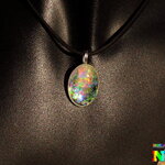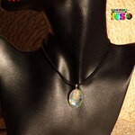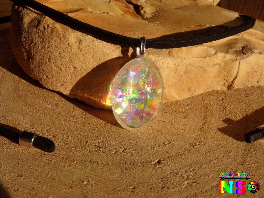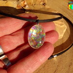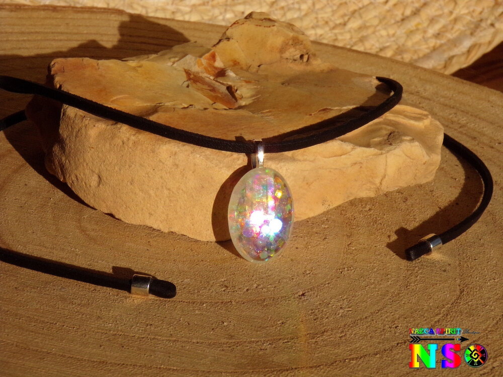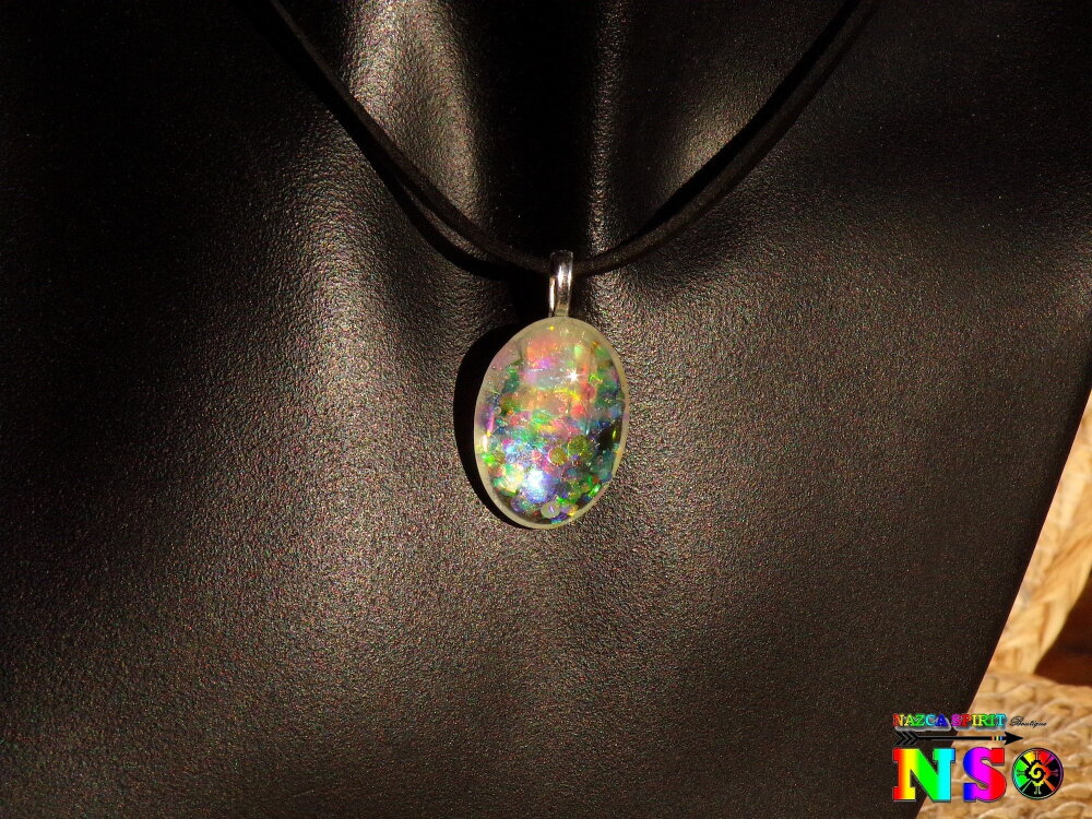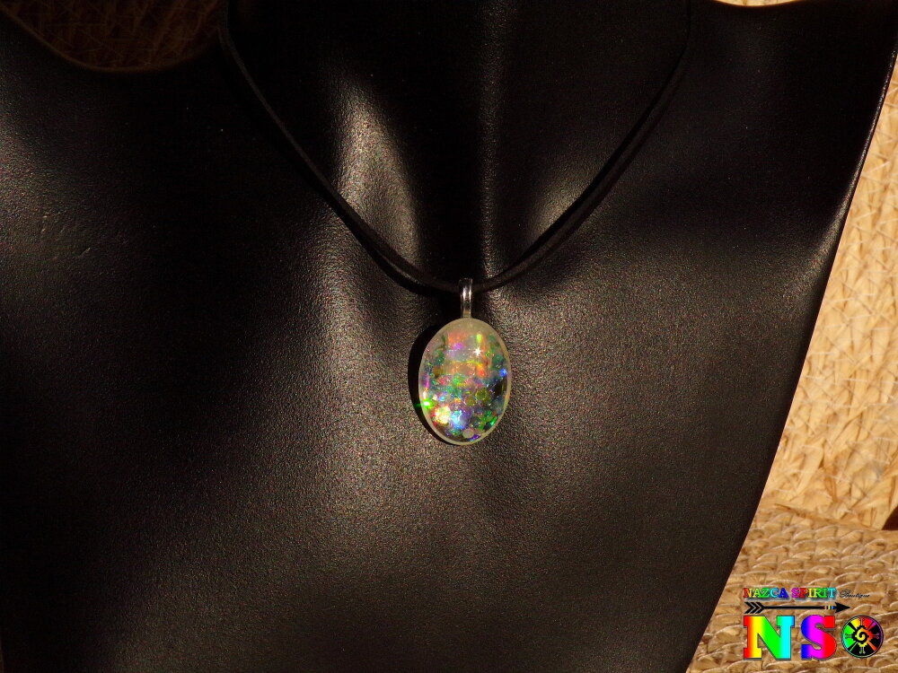 Au bout du tour de cou j'ai relié un pendentif que j'ai réalisé à partir d'une bélière en laiton plaqué argent, d'un cabochon ovale en verre effet loupe de 2.5 cm x 1.8 cm ("0.98 x "0.70), de particules holographiques et iridescentes, de poudre de Mica Iridescent pour apporter un léger effet opalescent et de résine cristal de finition.