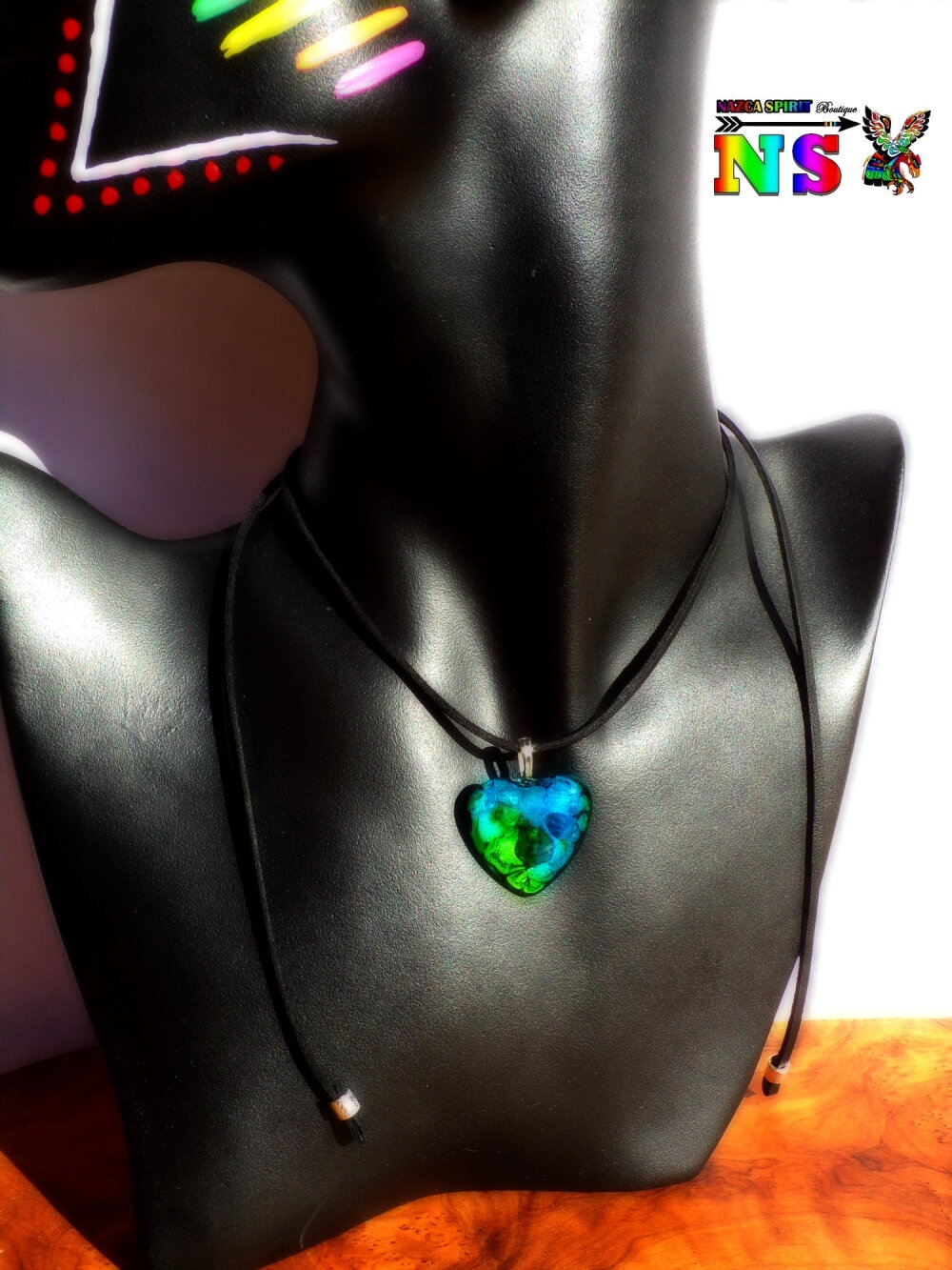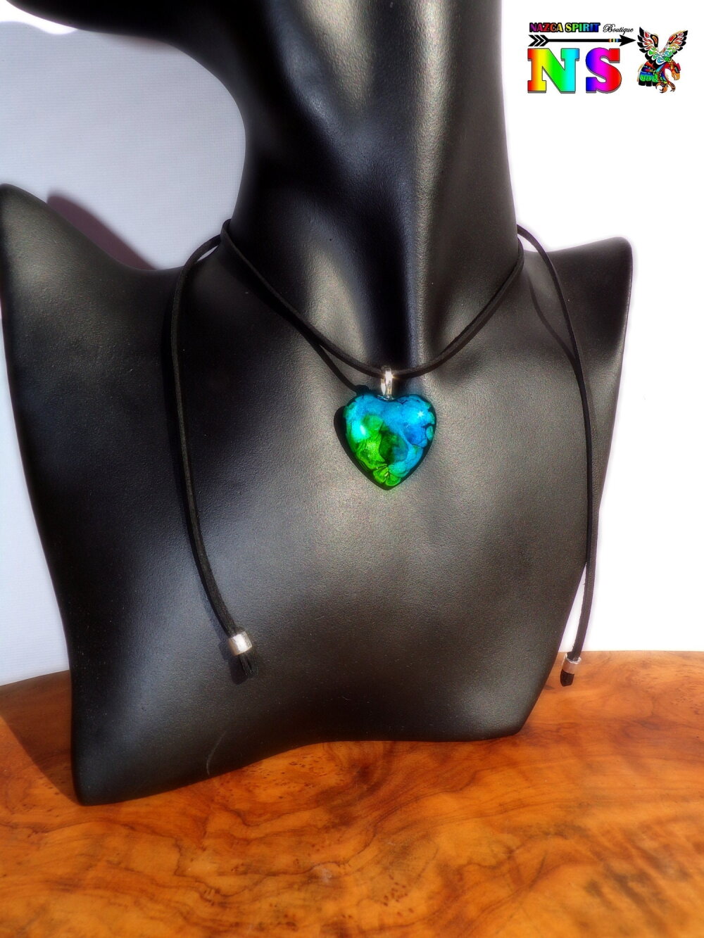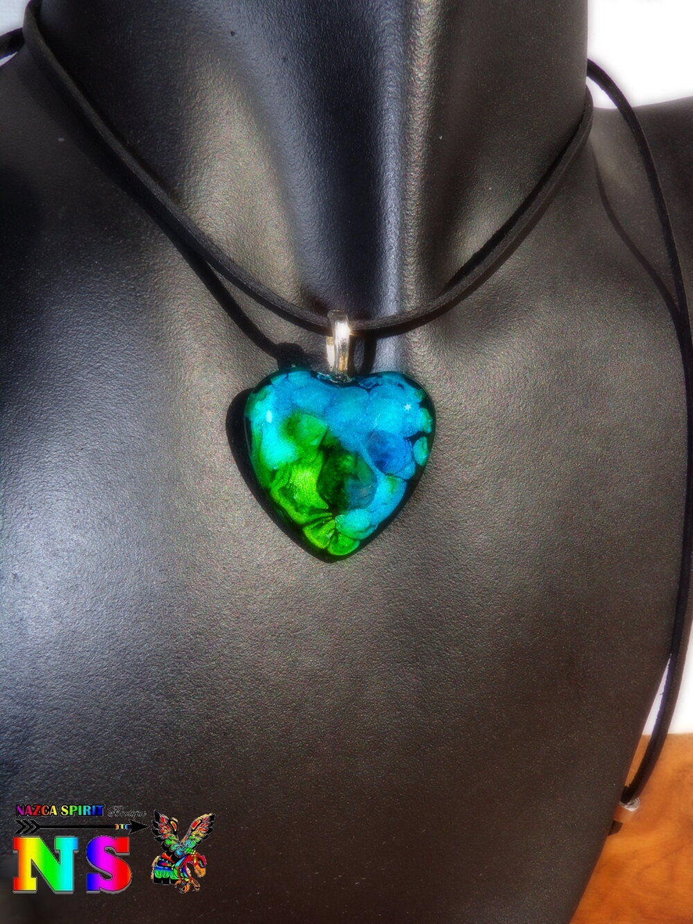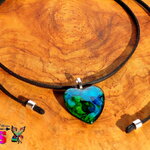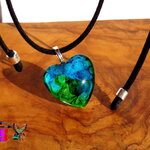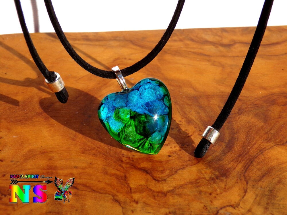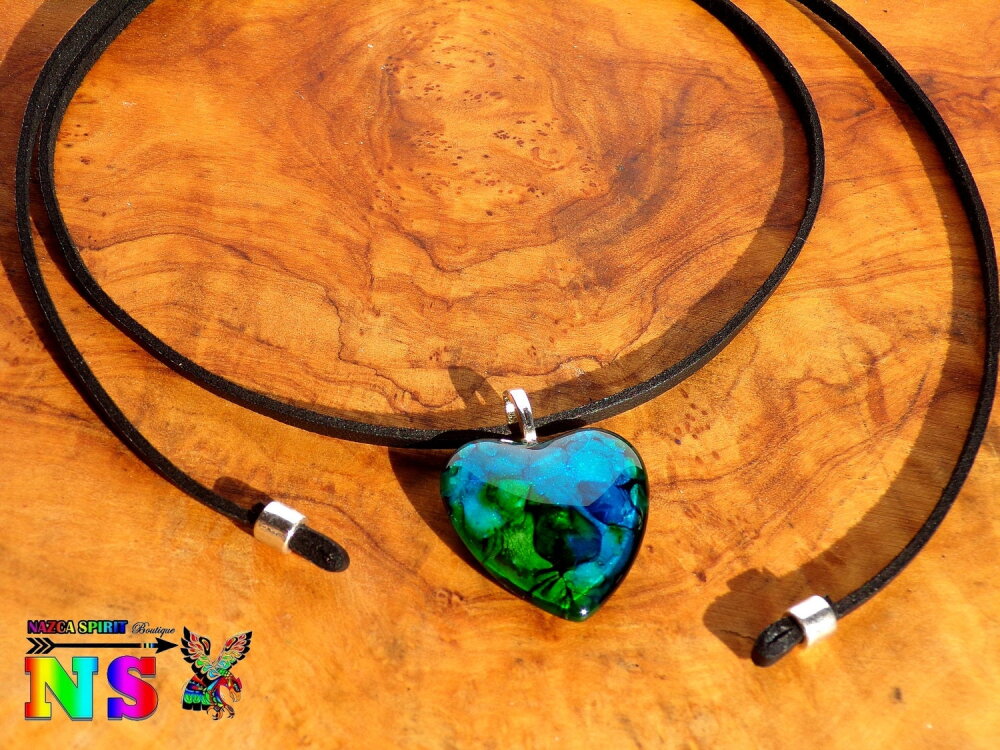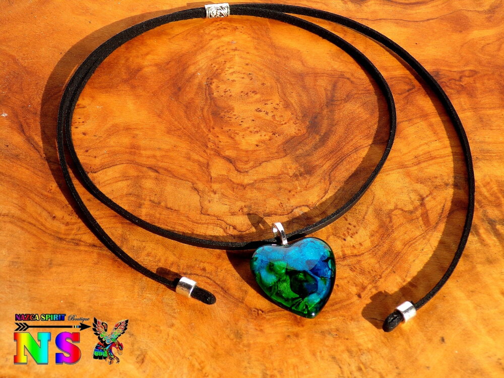 Le pendentif forme coeur est en verre bombé coloré à la main grâce à un procédé de coloration mis au point par l'Atelier Nazca Spirit et breveté auprès de l'INPI (Institut National de la Protection Industriel) qui est un organisme gouvernemental protégeant les innovations techniques.