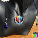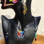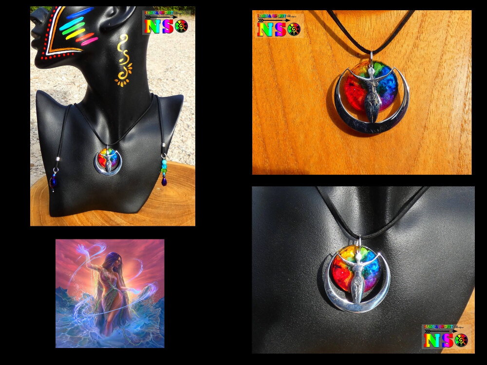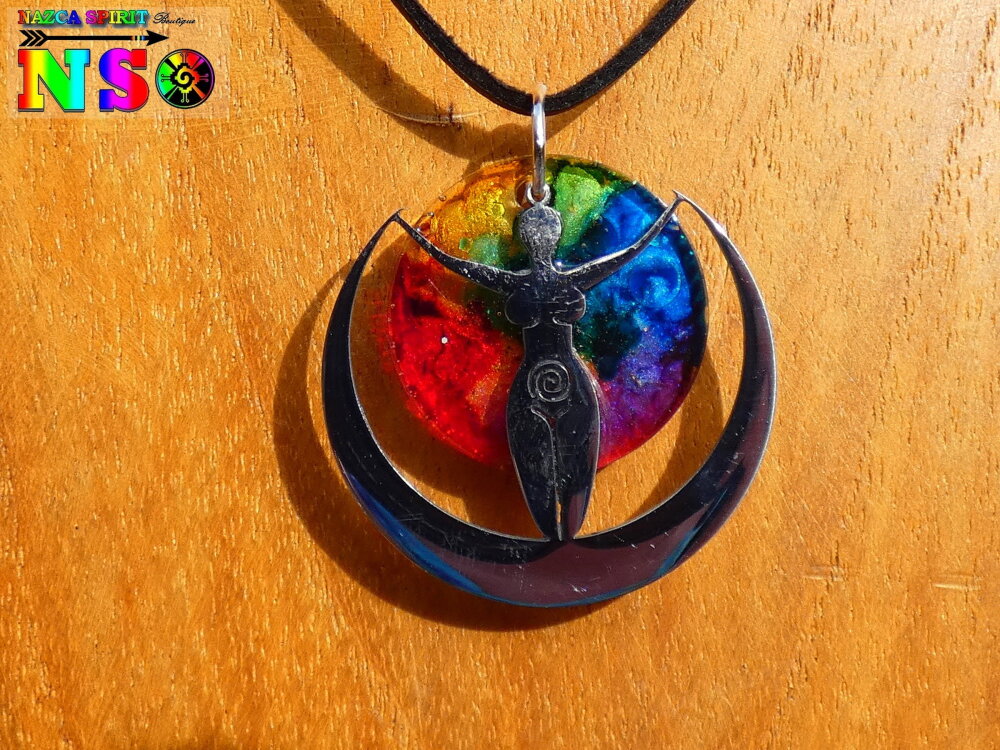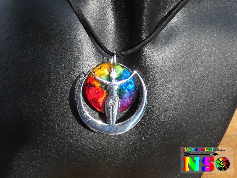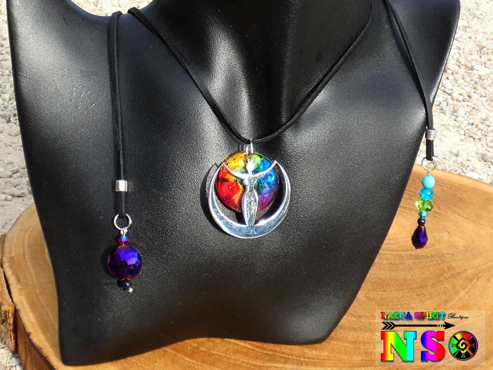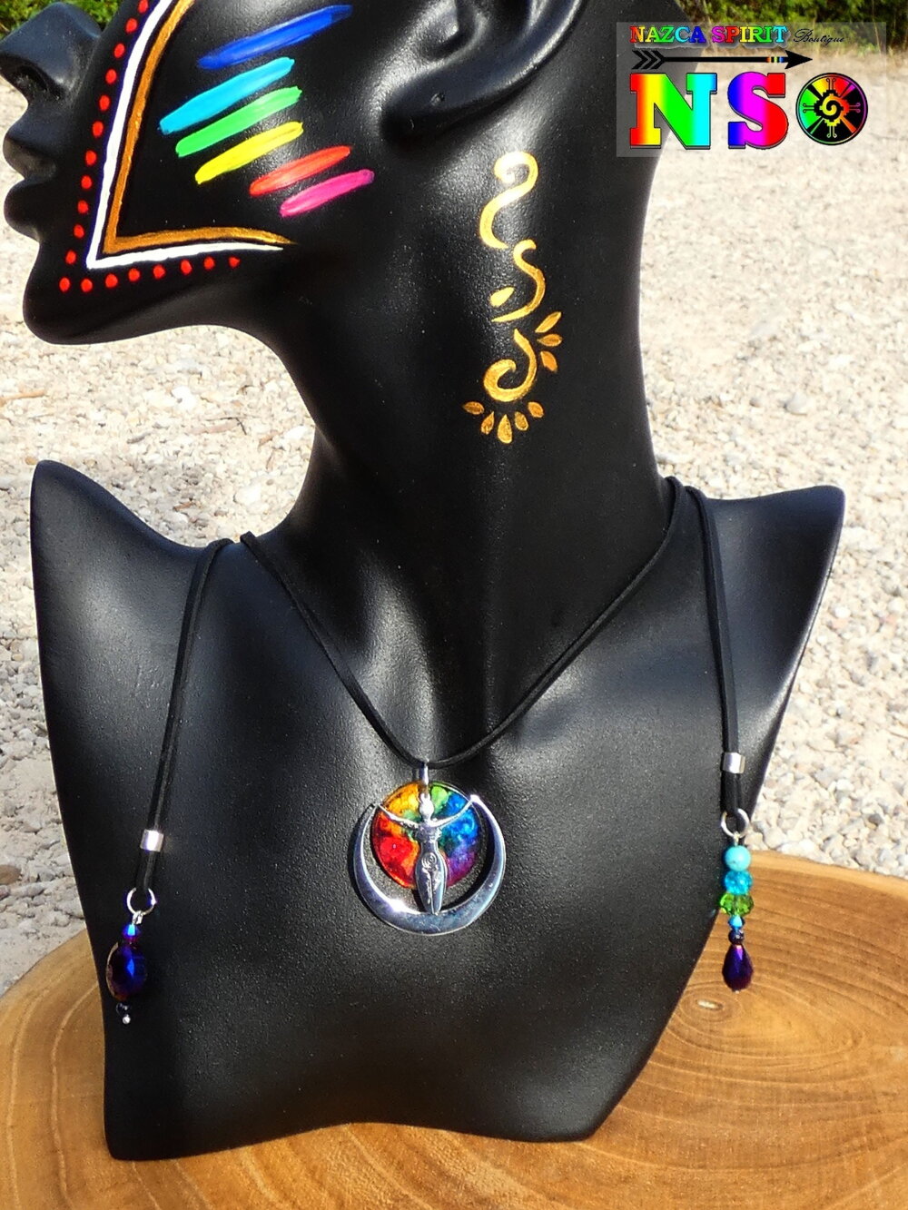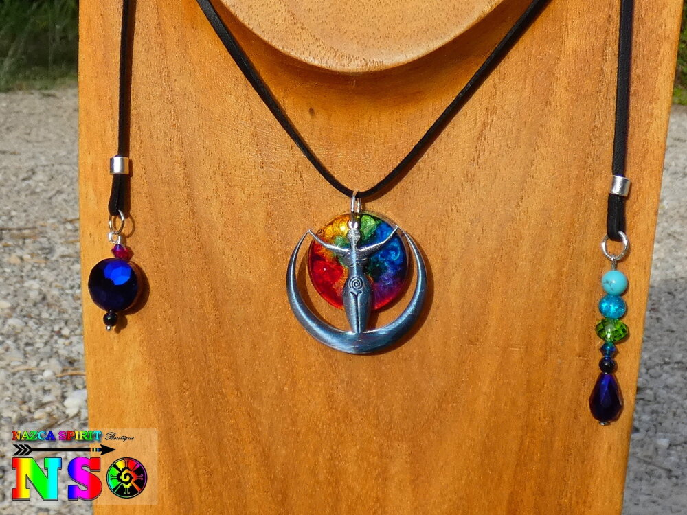 Particularités : détails ciselés sur le pendentif déesse / Disque multicolore avec effets iridescents / Le collier est équipé de deux liens de serrage au bout desquels ont été reliés des pendentifs fait main.