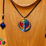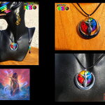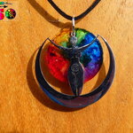 L'arrière du pendentif est équipé d'un disque en résine cristal que j'ai coloré à l'aide de pigments de couleurs haute densité et de pigments holographiques. Ce disque multicolore, qui représente, l'univers, a la particularité d'avoir ses couleurs qui changent en fonction de son orientation sous la lumière solaire (technique de coloration breveté auprès de l'I.N.P.I en 2013 par NAZCA SPIRIT)