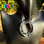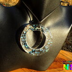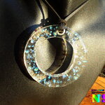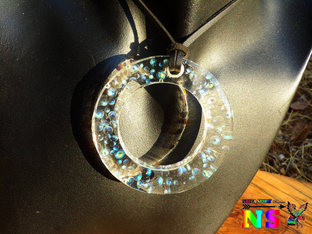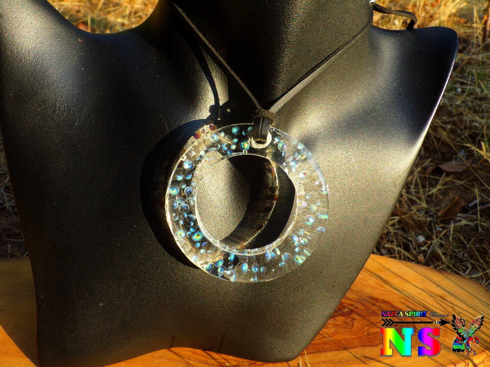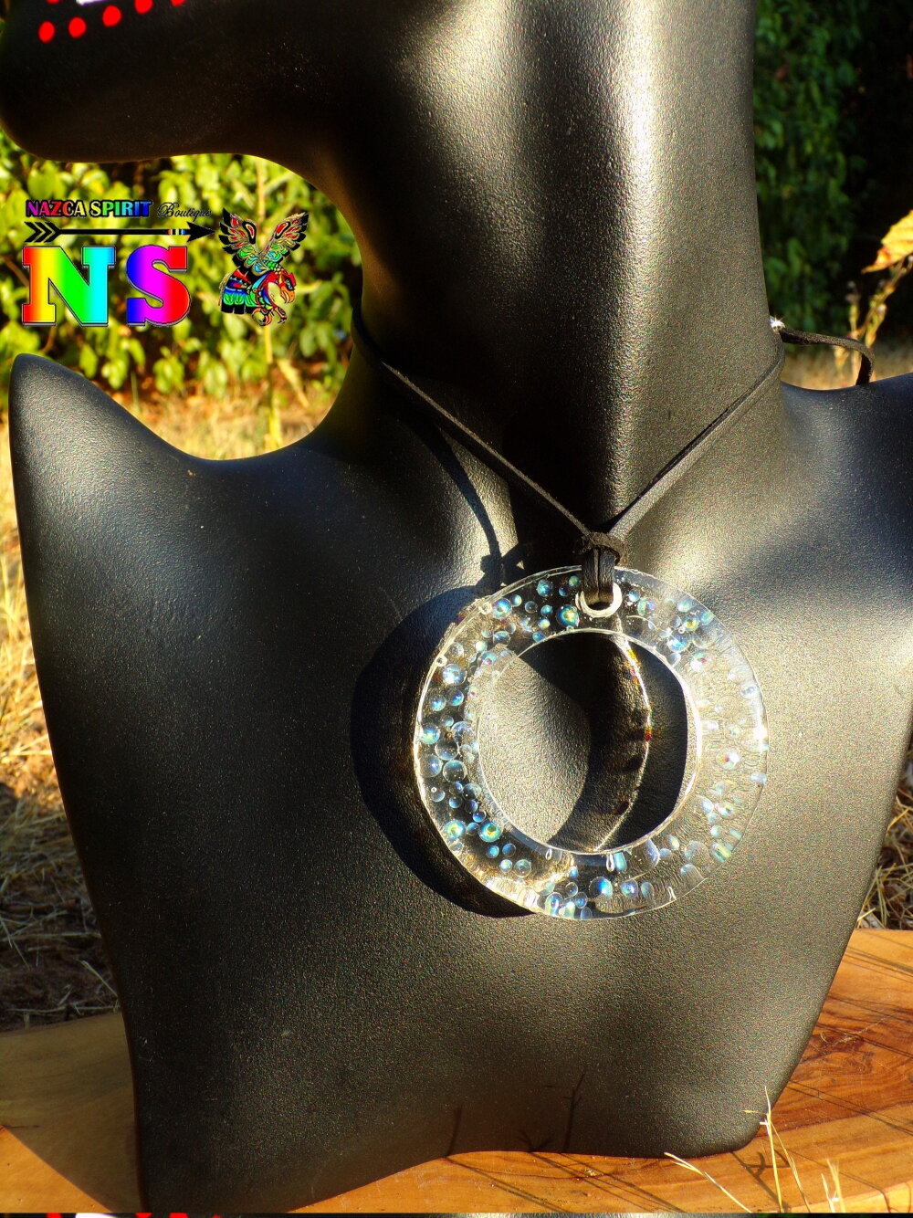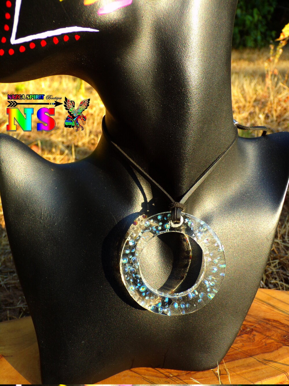 J'ai réalisé ce collier ajustable à l'aide de lacet en daim suédé effet cuir sur lequel j'ai relié un pendentif géométrique représentant un cercle évidé réalisé à la main à l'aide de résine cristal et de petites perles bulles en cristal de bohème iridescentes.