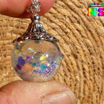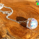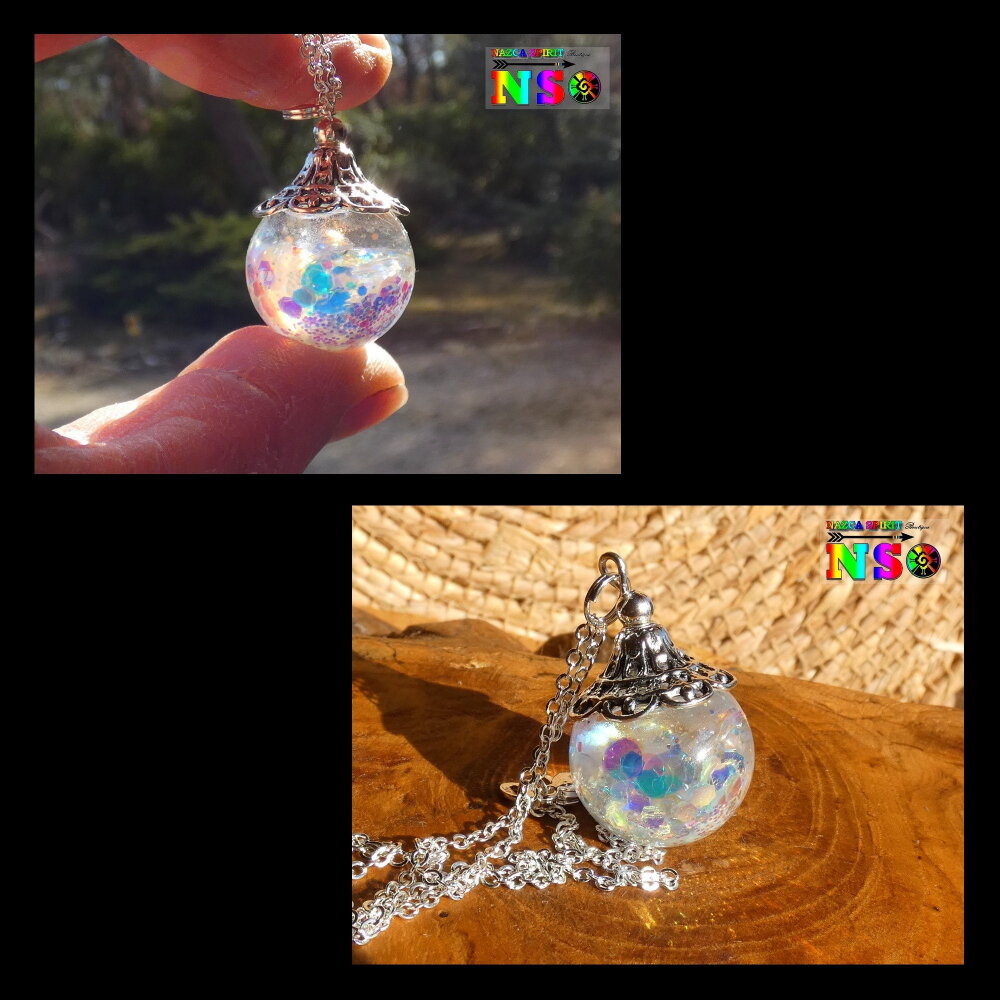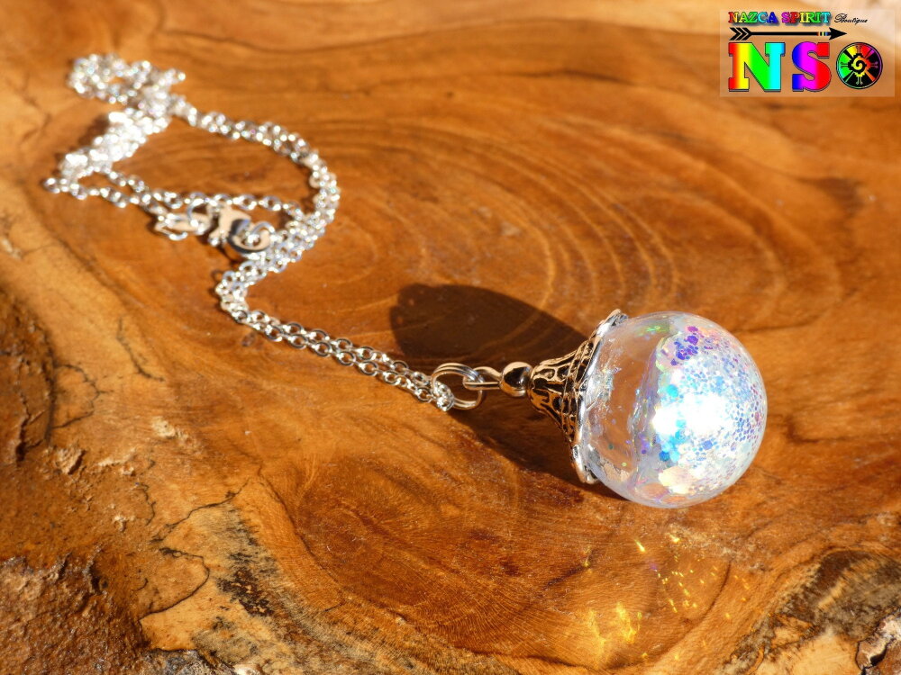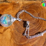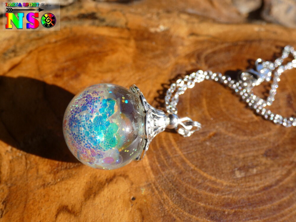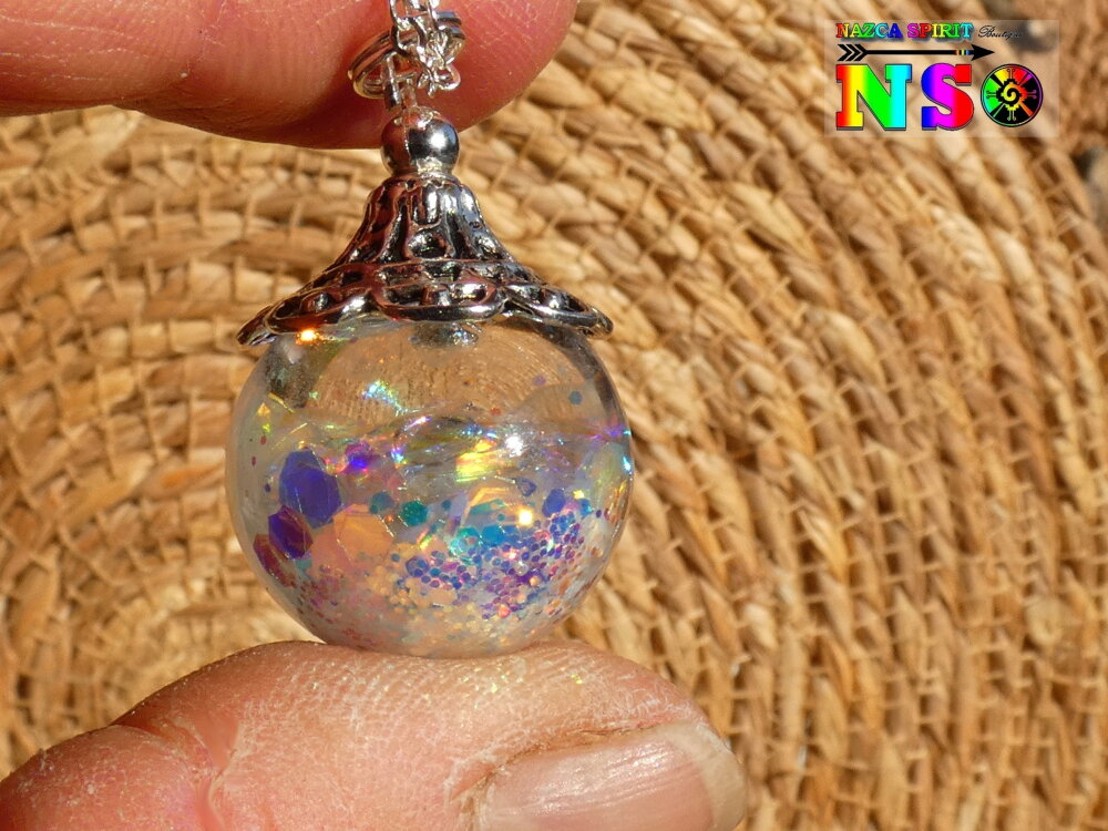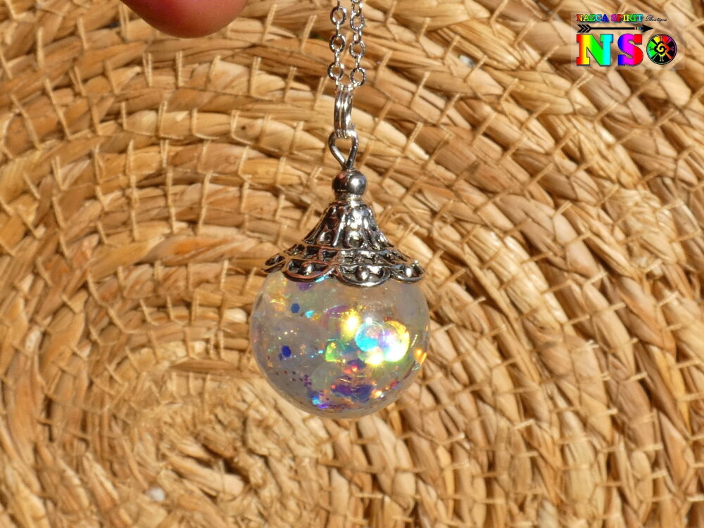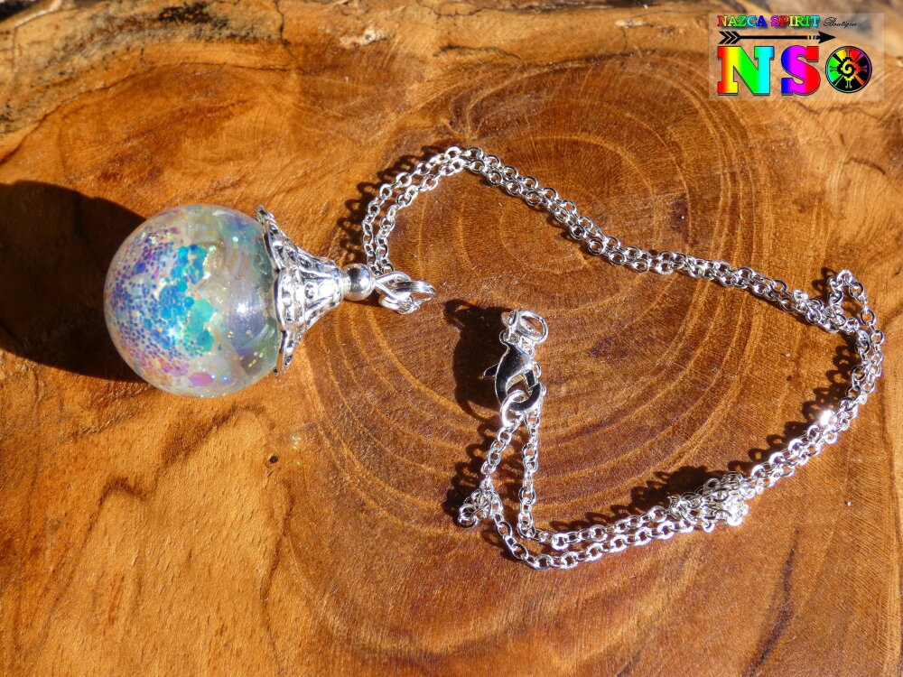 Je vous propose de découvrir un superbe bijou magique entièrement réalisé à la main. Le pendentif est une boule en verre de 2 cm de diamètre qui a été travaillée à l'aide de résine et de particules Ultra iridescentes et de poudre luminescente. Un bijou féérique unique super lumineux suspendu à une chaîne en argent 925 maille forçat de 40 cm de long qui se ferme à l'aide d'un fermoir mousqueton . Le sommet du pendentif a été réalisé à partir d'une coupelle ciselée en alliage tibétain que j'ai fait fusionner avec la résine sur le sommet de la boule en verre afin que la coupelle ne se détache jamais.