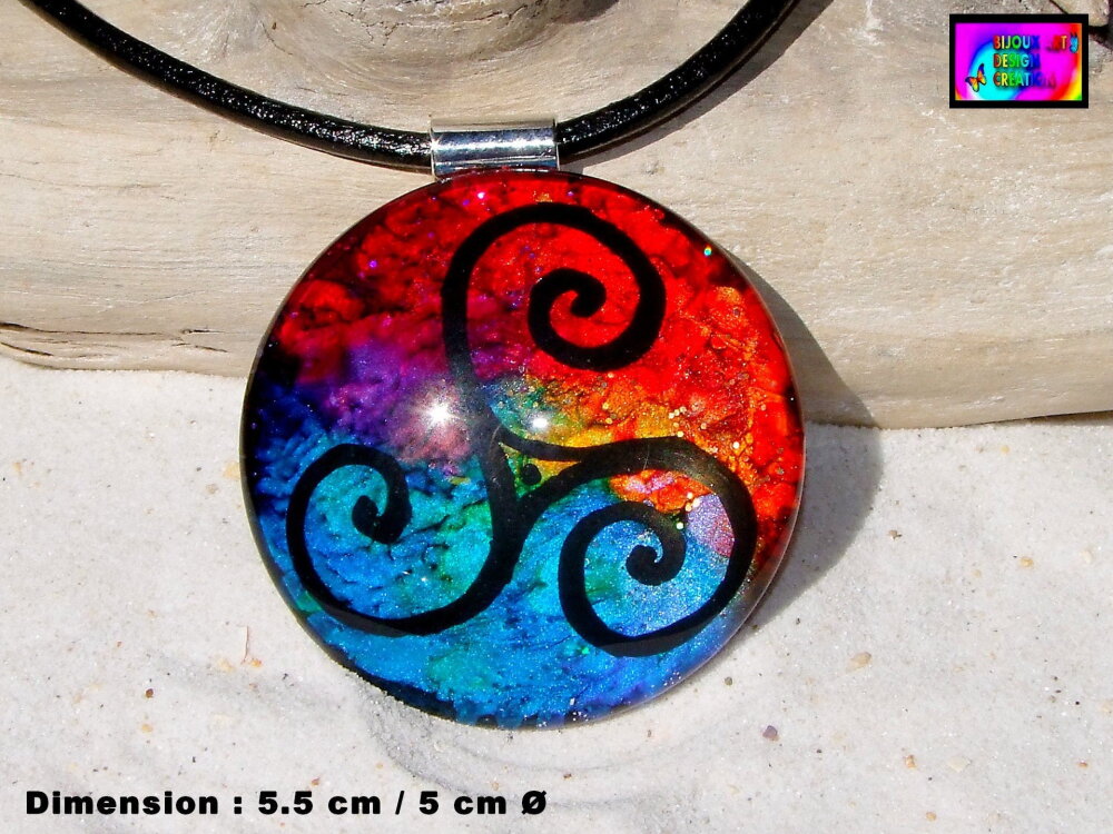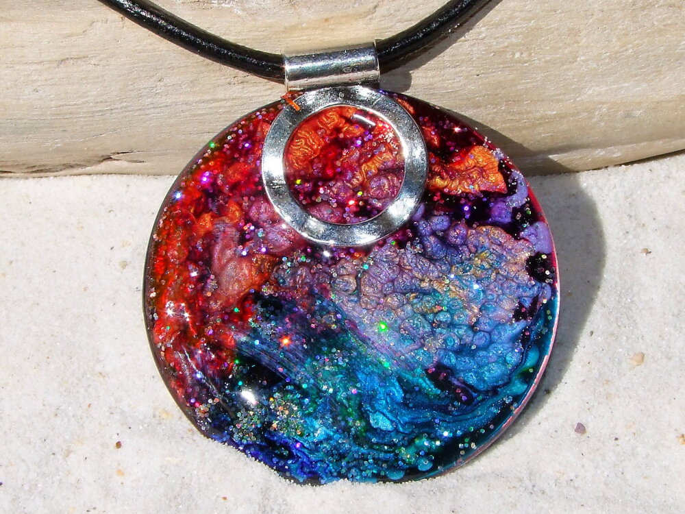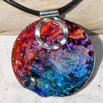 J'ai réalisé le pendentif à partir d'un cabochon rond de 5 cm de ∅ transparent effet loupe coloré à la main à l'aide d'une technique que j'ai inventée et mise au point en 2013 à l'arrière duquel j'ai fixé à la résine cristal une bélière représentant un cercle Design martelé.