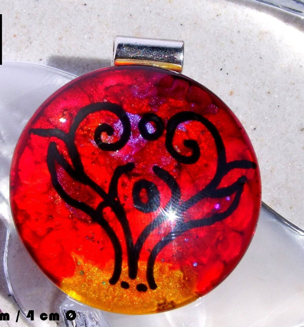 Ce pendentif entièrement réalisé à la main à partir d'un cabochon rond de 4 cm de ∅ transparent effet loupe coloré à l'aide d'une technique que j'ai inventée et mise au point en 2013. Le dessin représentant un taureau camarguais stylisé a été réalisé à main levée.