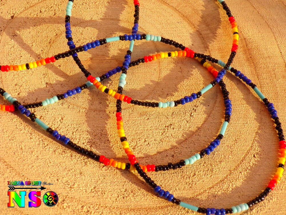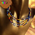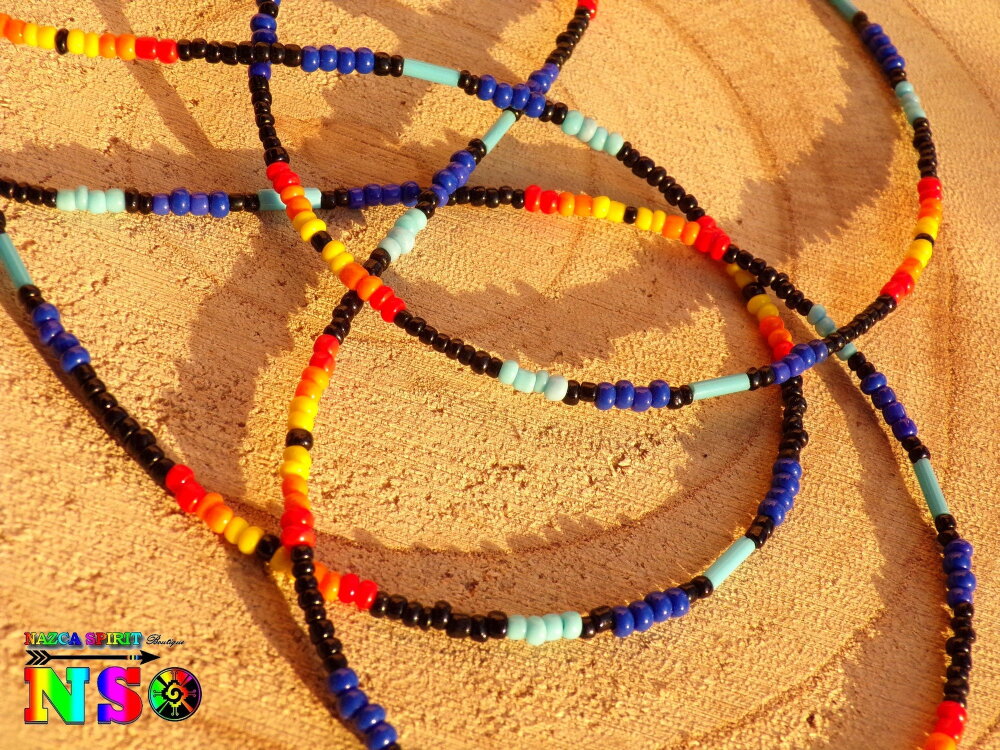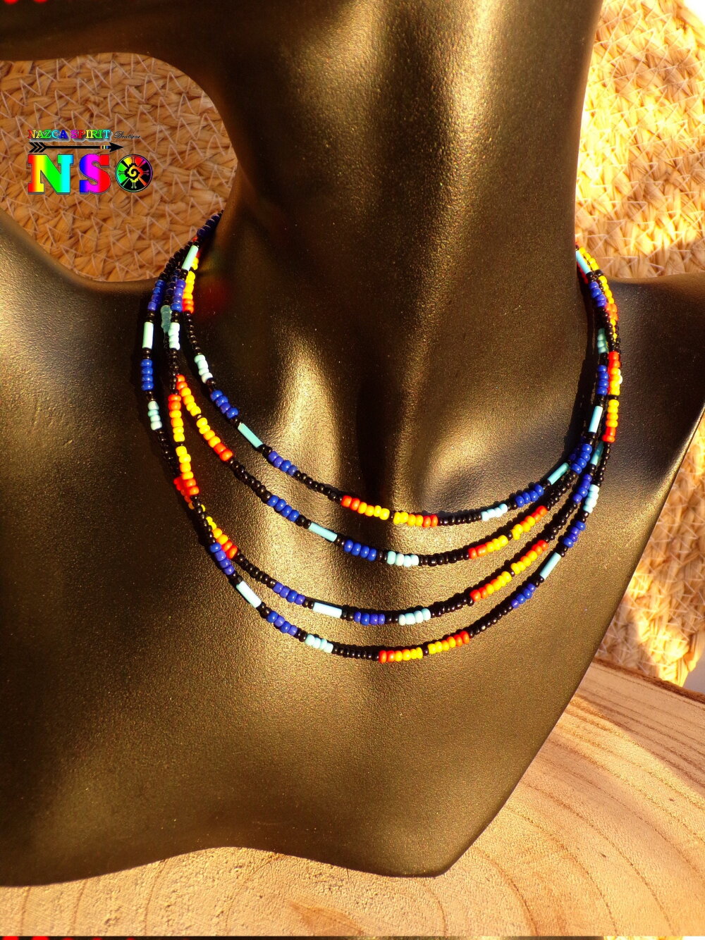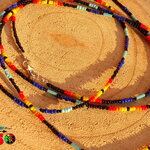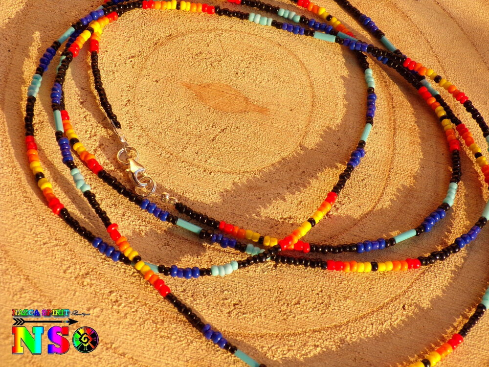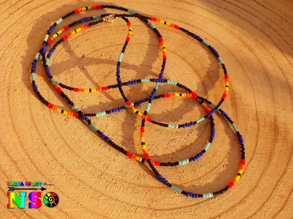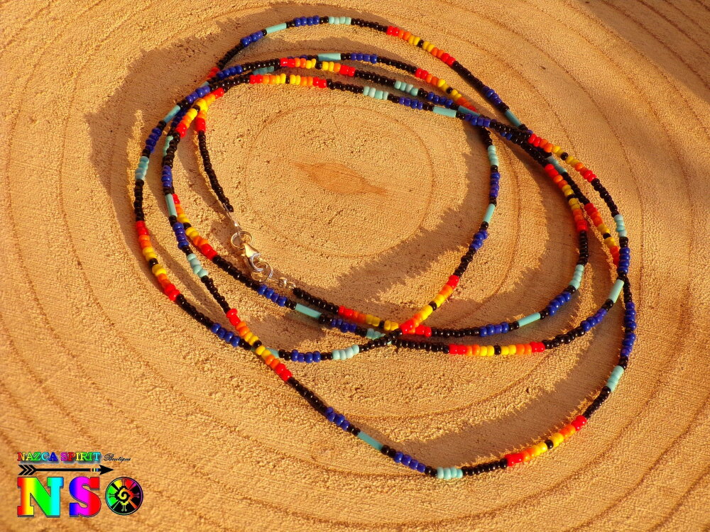 Passionnée par les bijoux Navajo, j'ai voulu créer un collier sautoir inspiré de leurs colliers en perles multicolores qui pourrait être porté de différentes façons. Le collier mesure au total 1.30 mètres de long ("51.18). Grâce à cette dimension vous pourrez enrouler le collier autour de votre cou, afin d'obtenir plusieurs rangs (2 rangs, 3 rangs, 4 rangs). En fait le nombre de rangs que vous obtiendrez dépendra de la taille de votre cou.