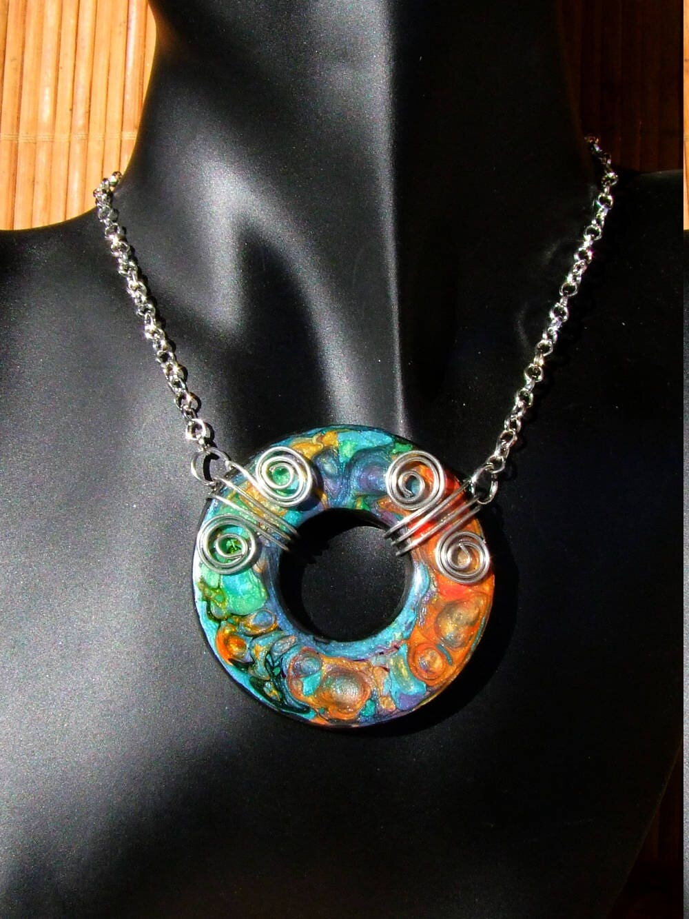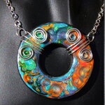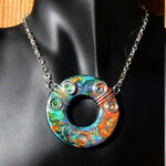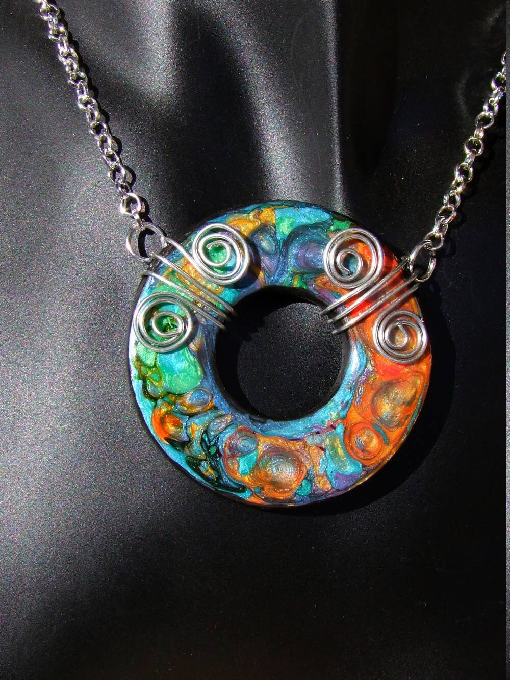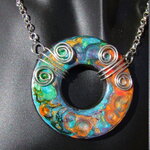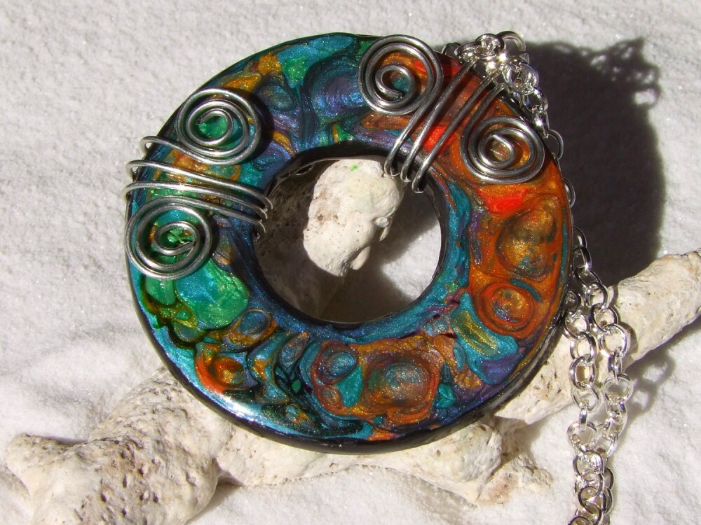 Je vous présente un collier ras de cou intégralement réalisé à la main à partir d'un disque forme donut de 5 cm Ø ("1.96) en acier inoxydable que j'ai coloré à la main à l'aide de peintures à effets iridescents. Le verso du pendentif a été peint en noir à l'aide d'une peinture spéciale pour métaux et céramiques.