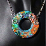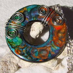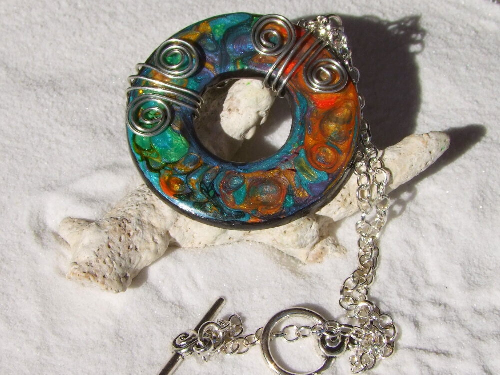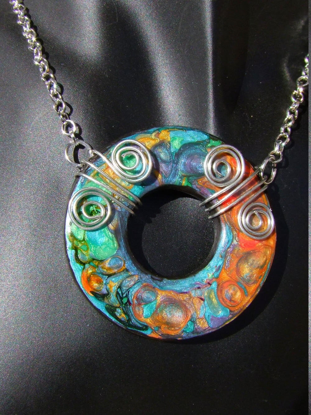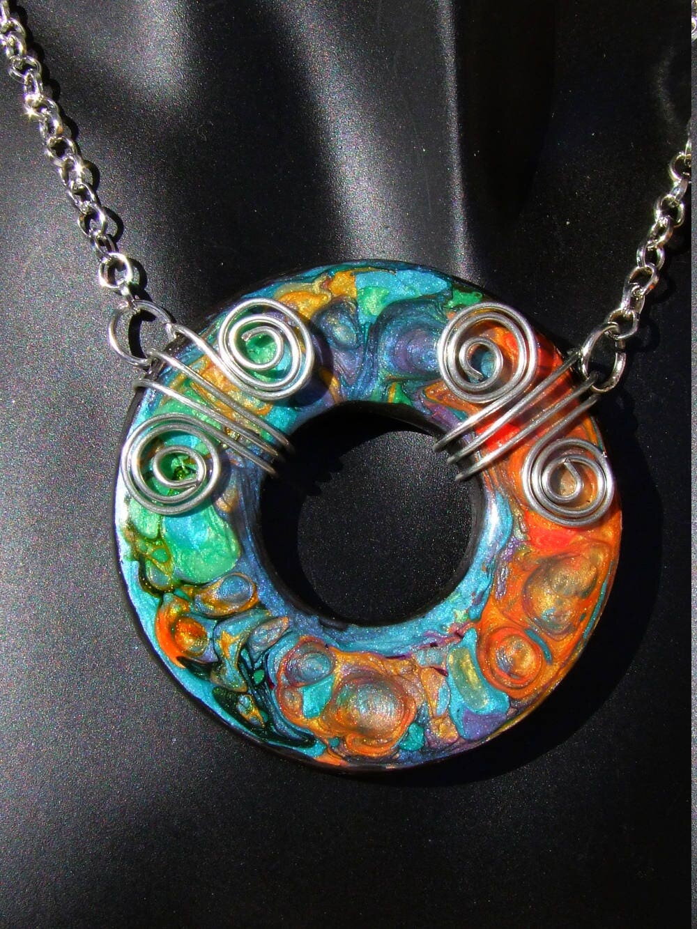 Je vous présente un collier ras de cou intégralement réalisé à la main à partir d'un disque forme donut de 5 cm Ø ("1.96) en acier inoxydable que j'ai coloré à la main à l'aide de peintures à effets iridescents. Le verso du pendentif a été peint en noir à l'aide d'une peinture spéciale pour métaux et céramiques.