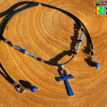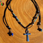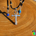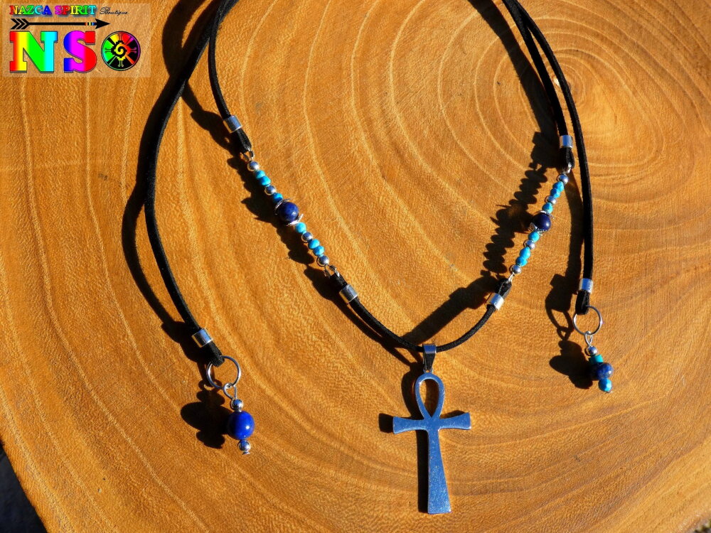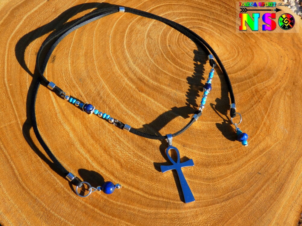 Je vous propose de découvrir un collier ajustable inspiré des bijoux égyptiens que j'ai entièrement réalisé à la main à partir de lacet en daim suédé finition effet cuir, de câble en acier gainé, de perles rondes de 6 mm ("1.52) en véritable lapis lazuli naturel provenant d'Egypte, de petites perles facettées de 4 mm ("0.15) en véritable turquoise stabilisée sleeping beauty originaire des U.S.A, de petites perles rondes et de coupelles fleurs ciselées en cuivre plaqué argent et d'une grande croix d'Ankh en titane couleur argent brillant.