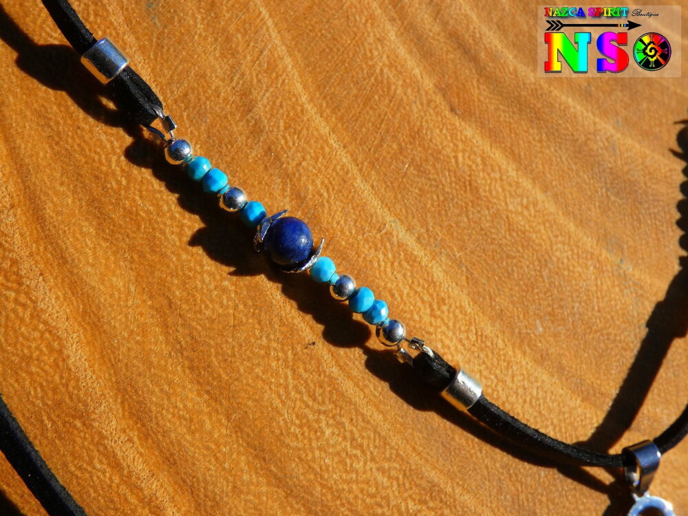Le tour de cou est ajustable grâce à un système coulissant qui permet de passer le collier par le sommet de la tête. Pour ajuster le collier à votre cou, il vous suffira juste de tirer sur les 2 liens équipés de deux petits pendants que vous pourrez laisser pendre soit sur le devant de votre cou, soit à l'arrière au niveau de votre dos. Ces 2 petits pendants ont été réalisés à partir de perles en lapis lazuli (Origine : Egypte) et de perles en turquoises sleeping beauty et turquoise Ithaca (Origine : U.S.A).