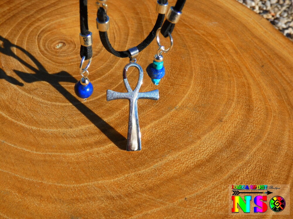 Collier Egyptien Ajustable Pendentif Croix de Vie Egyptienne Ankh Titane Argent - Bijou Précieux Lapis Lazuli et Turquoises Sleeping Beauty.