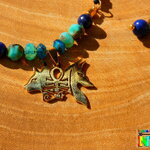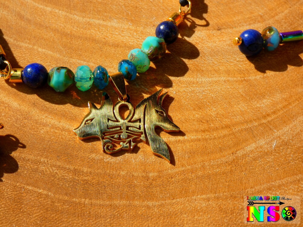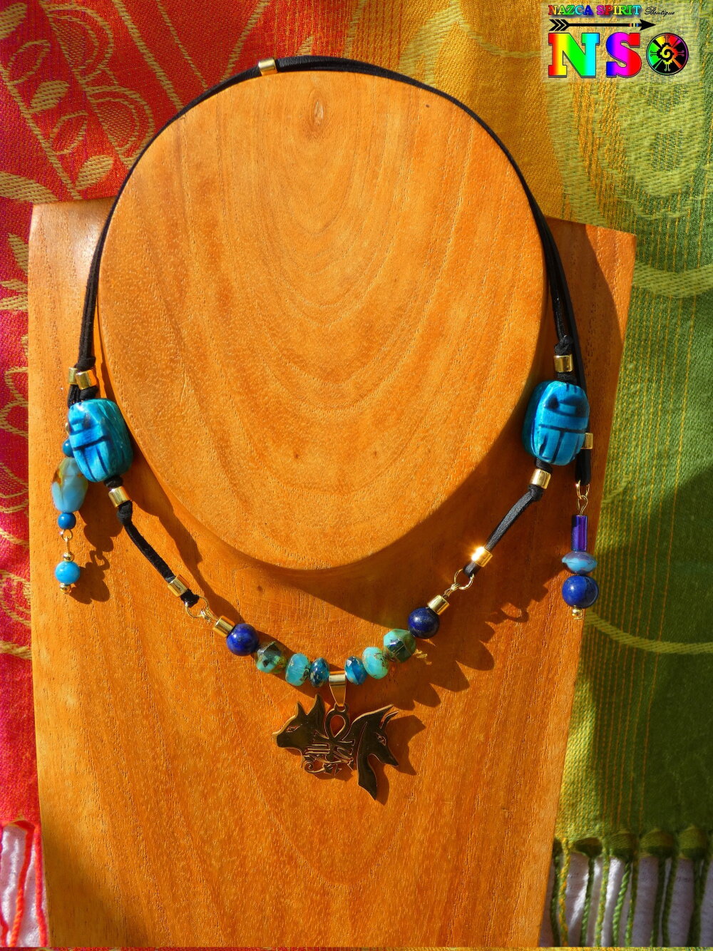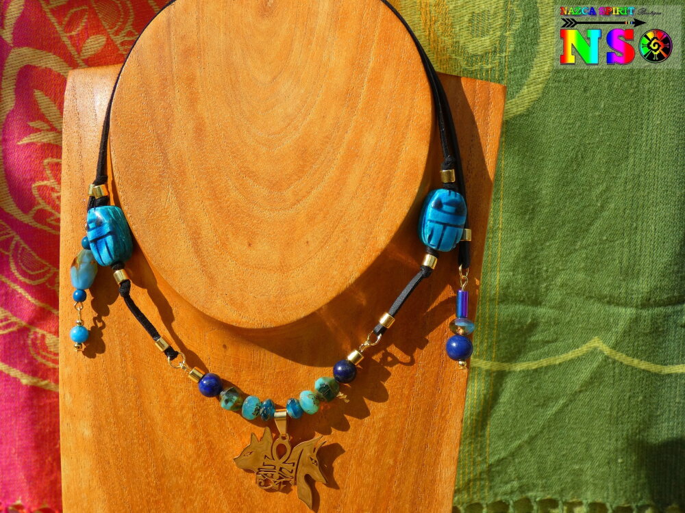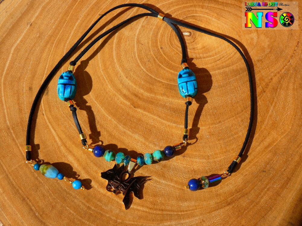 Toutes les perles situées sur la base du tour de cou (appelé connecteur) ont été montées avec grand soin sur un fil en acier gainé afin d'apporter une grande solidité à ce superbe bijou. Au bout de ce connecteur réalisé à partir de perles en véritable Lapis Lazuli égyptien et de perles en cristal de bohème j'ai relié un superbe pendentif en acier ciselé plaqué or représentant les dieux Bastet (chat) et Anubis (chacal). J'ai également ajouté des perles scarabées de 2.5 cm de long en céramique émaillée artisanale bleu turquoise provenant tout droit d'Egypte. Les perles ont été gravées sur la partie verso de symboles égyptiens.