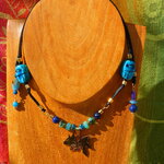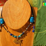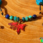 Le tour de cou est ajustable grâce à un système coulissant vous permettant d'agrandir le collier puis de l'ajuster à votre cou. Vous pourrez ainsi porter ce collier très original soit en ras de cou, soit en collier mi-long, soit en tant que sautoir. A chaque bout du tour de cou j'ai relié des petits pendentifs réalisés à partir de perles en cristal de bohème, d'une perle en véritable lapis lazuli, de perles en chrysocolle teinté, d'une perle en larimar et d'une perle tube en hématite arc-en-ciel.