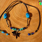 Je vous propose de découvrir un collier d'inspiration Egypte antique réalisé entièrement à la main à partir de lacet en daim suédé effet finition cuir, de tiges et perles en laiton plaqué or (rondes et tubes), de fil en acier gainé, de perles facettées en cristal de bohème (Origine : Tchécoslovaquie), de perles rondes de 9 mm de diamètre en véritable Lapis Lazuli (Origine : Egypte), d'une perle en Larimar (Origine : République Dominicaine), de petites perles rondes en chrysocolle teintée, d'une perle tube en hématite arc-en-ciel et de perles scarabées en céramique émaillée bleu turquoise originaires d'Egypte.