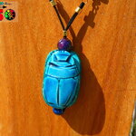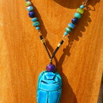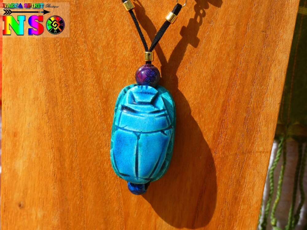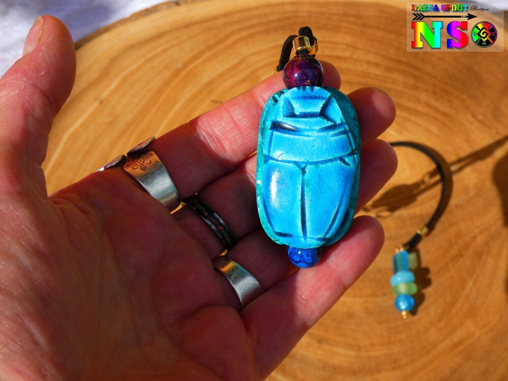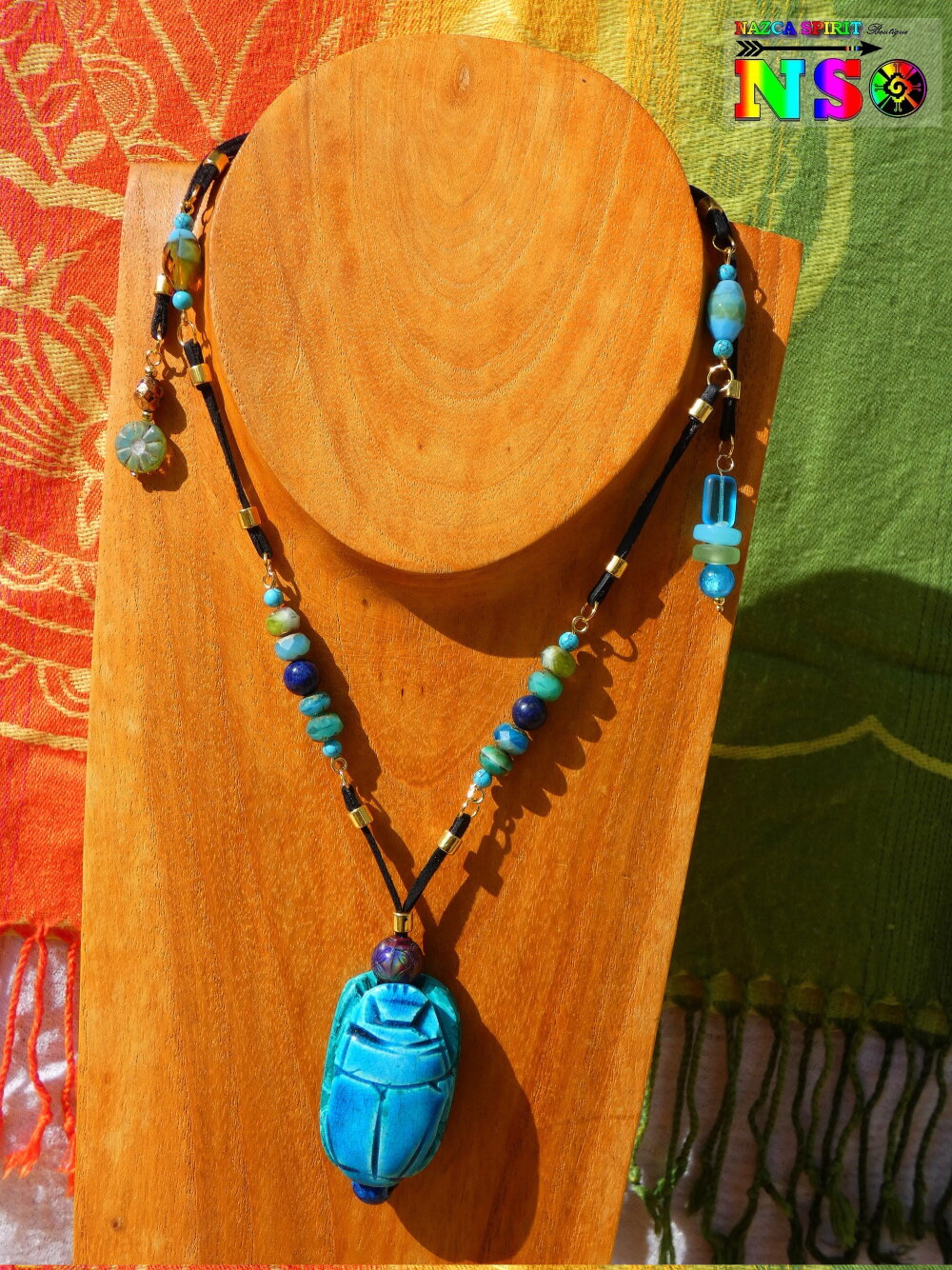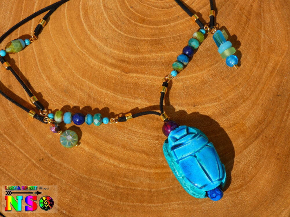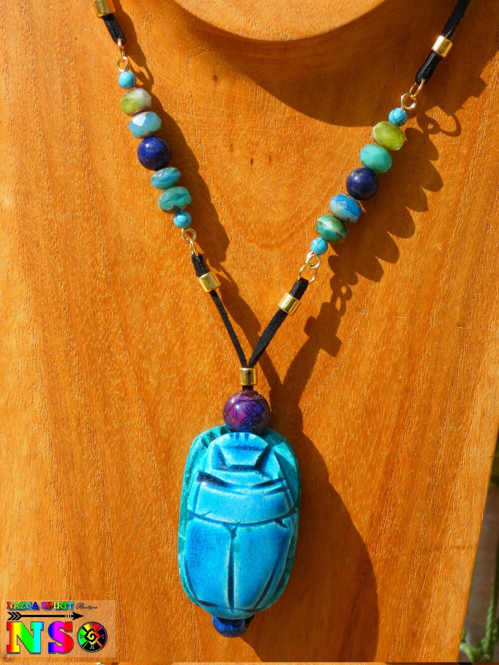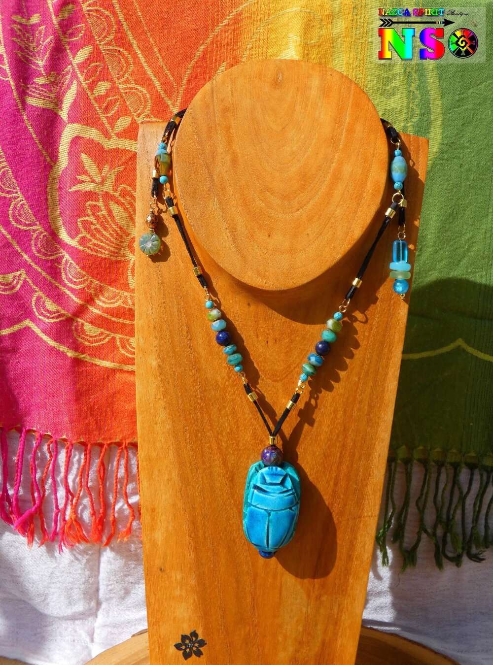 Collier Egyptien Ajustable Pendentif Scarabée en Céramique Emaillée Bleu Turquoise - Bijou Fait Main en Lapis Lazuli d'Egypte et Cristal Bohème