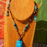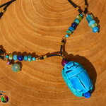 Je vous propose de découvrir un collier d'inspiration Egypte antique réalisé entièrement à la main à partir de lacet en daim suédé effet finition cuir, de tiges et perles en laiton plaqué or (rondes et tubes), de perles facettées en cristal de bohème (Origine : Tchécoslovaquie), de perles rondes de 9 mm de diamètre en véritable Lapis Lazuli (Origine : Egypte), de petites perles rondes en turquoise Ithaca (Origine : USA), d'une perle ronde gravées en pâte polymère thermo changeante appelée également perle d'humeur, et d'une très grande perles scarabée en céramique artisanale émaillée bleu turquoise originaires d'Egypte.