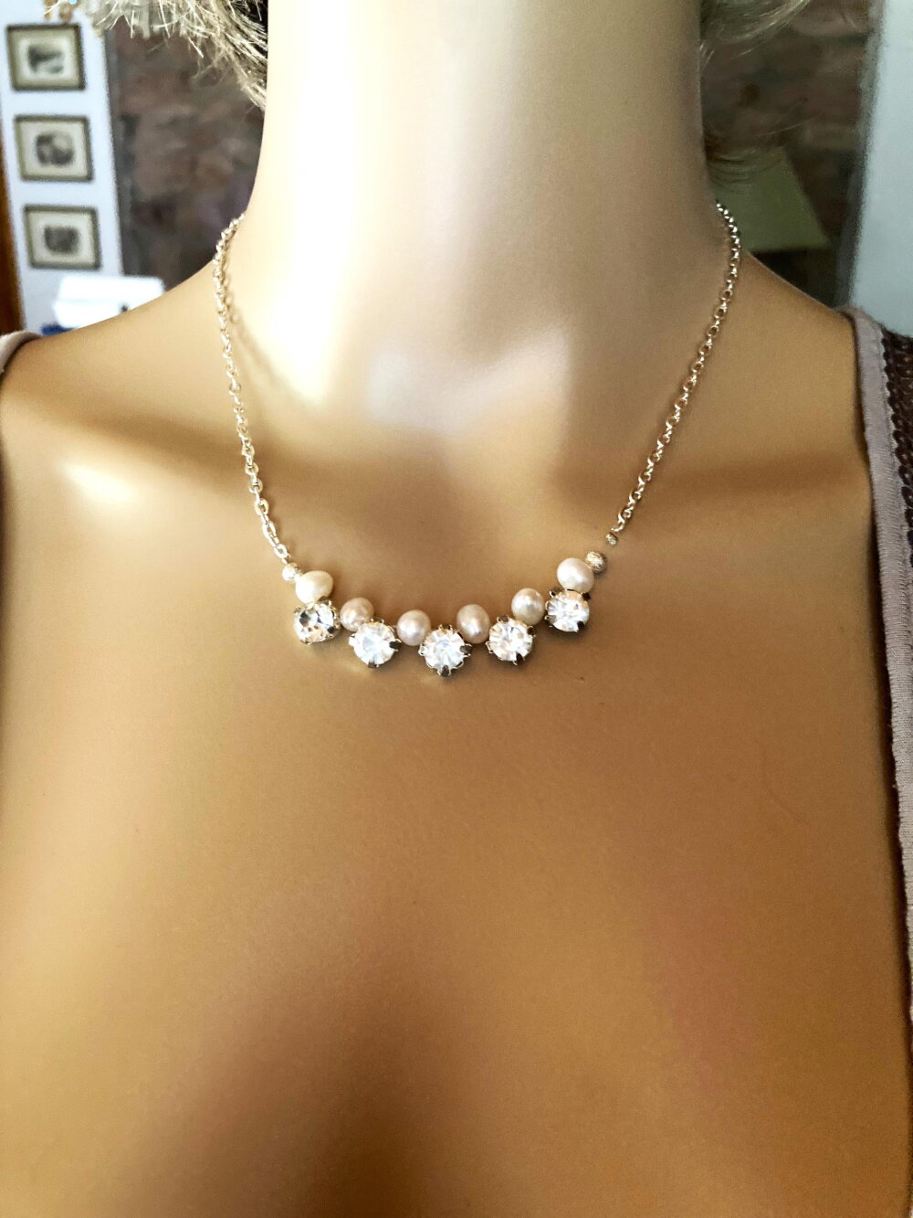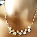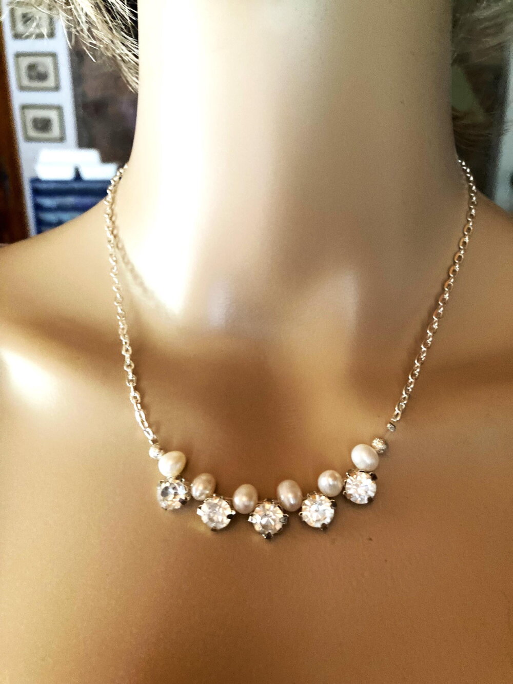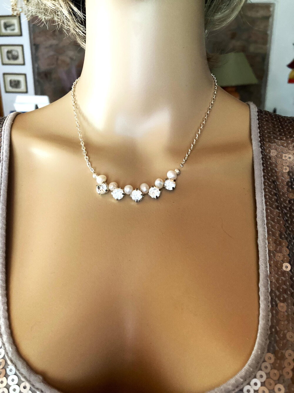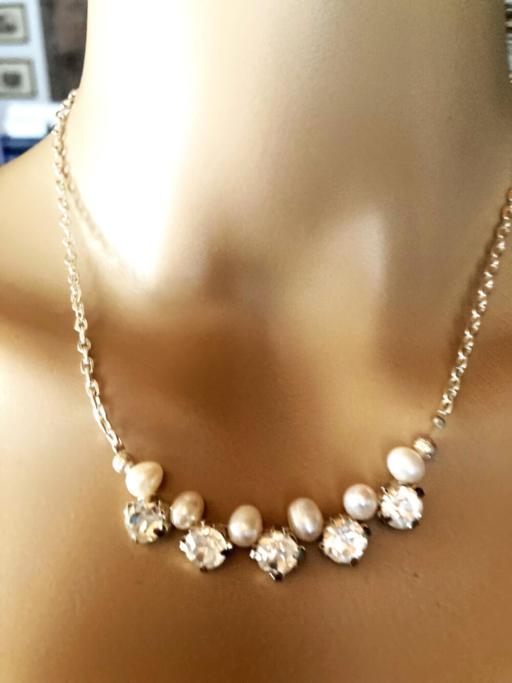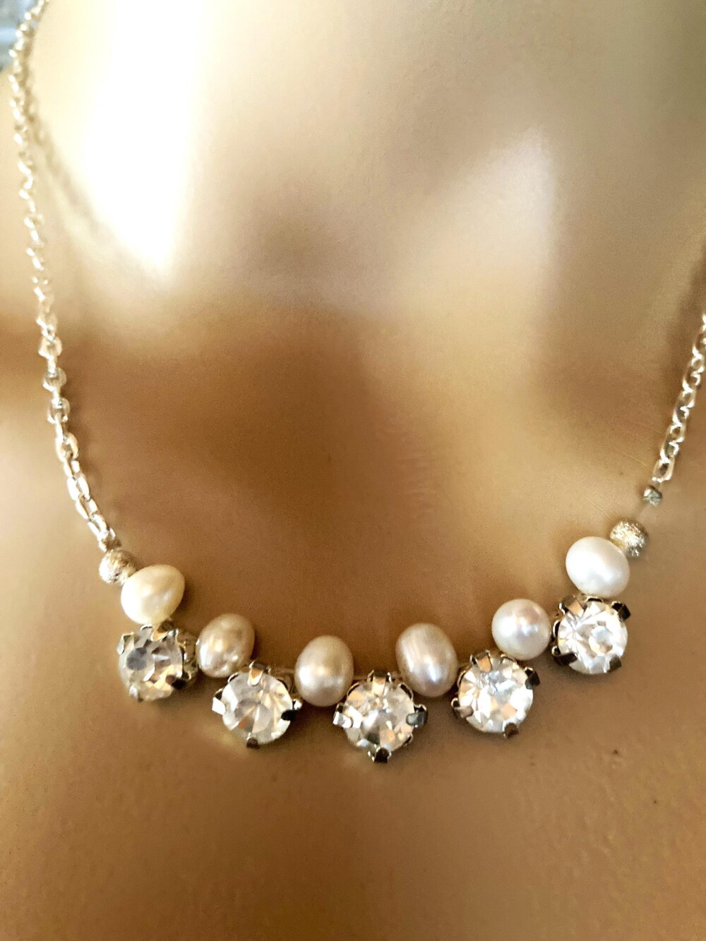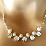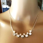 collier élégant perles de culture eau douce baroque blanche avec cristal clair sur chaîne argentée bijoux femme.