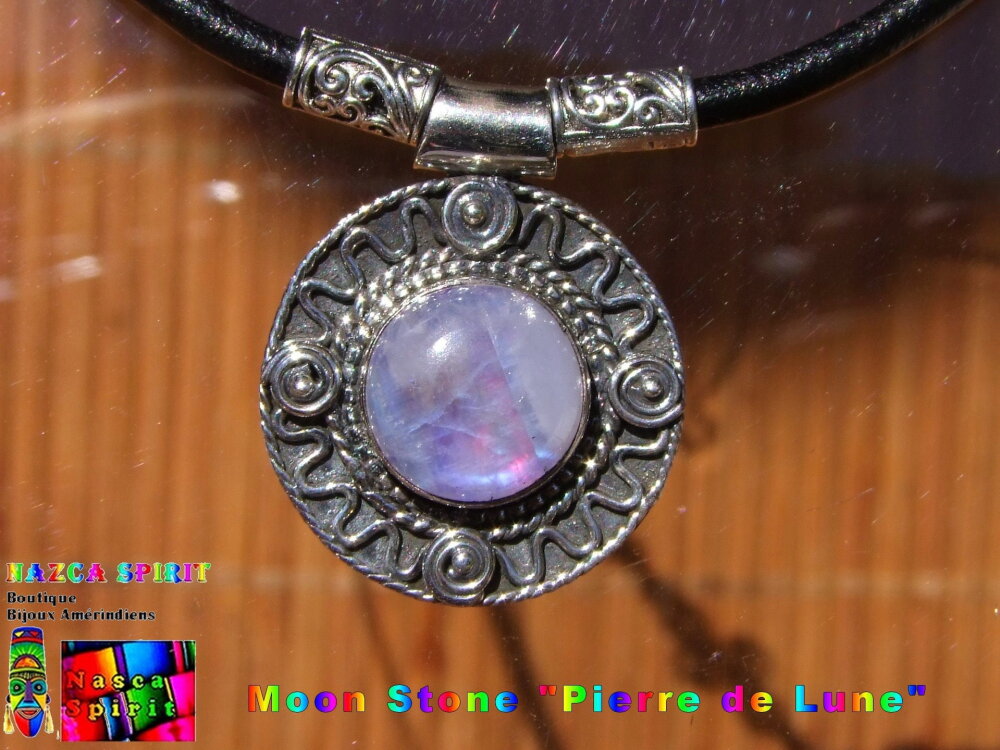 Le pendentif mesure 3.2 cm x 2.5 cm de ∅. Sur le pendentif en argent a été serti une Véritable Pierre de Lune "Moonstone" de forme ronde de 1.3 cm de ∅ aux reflets iridescents.