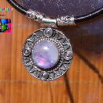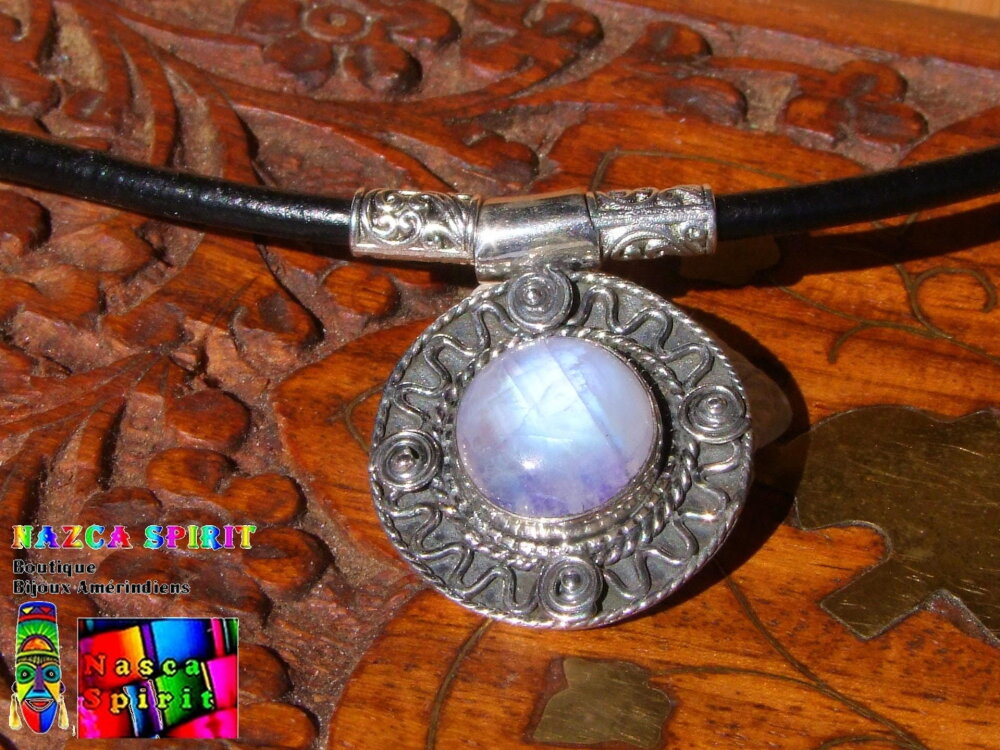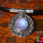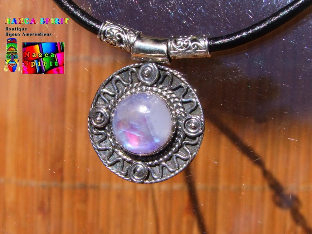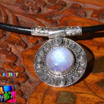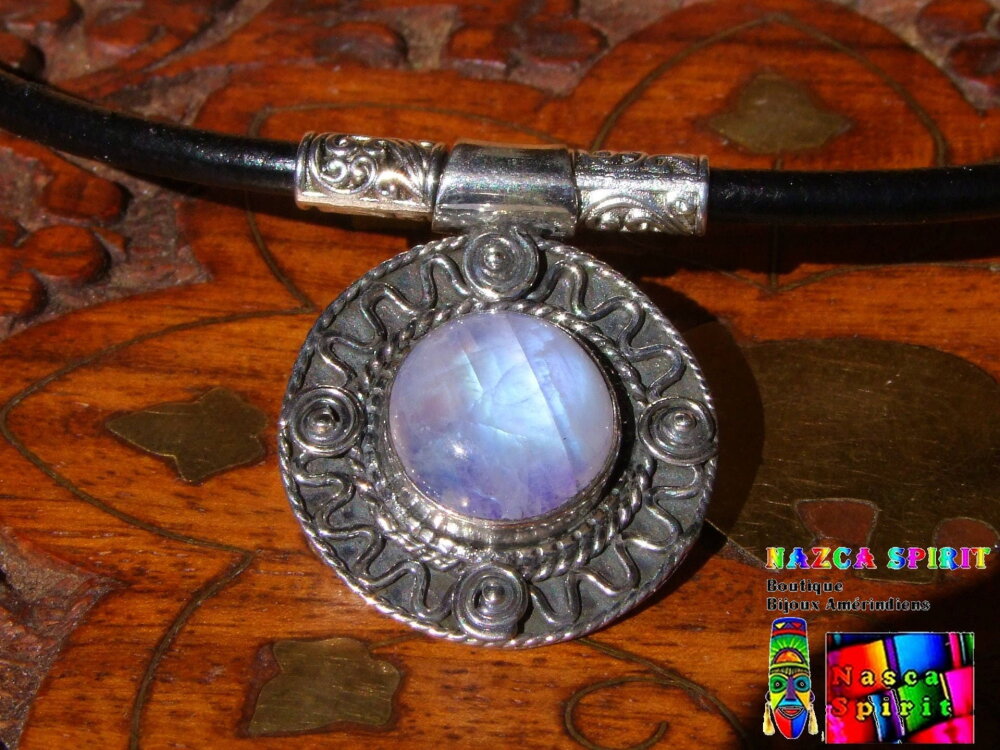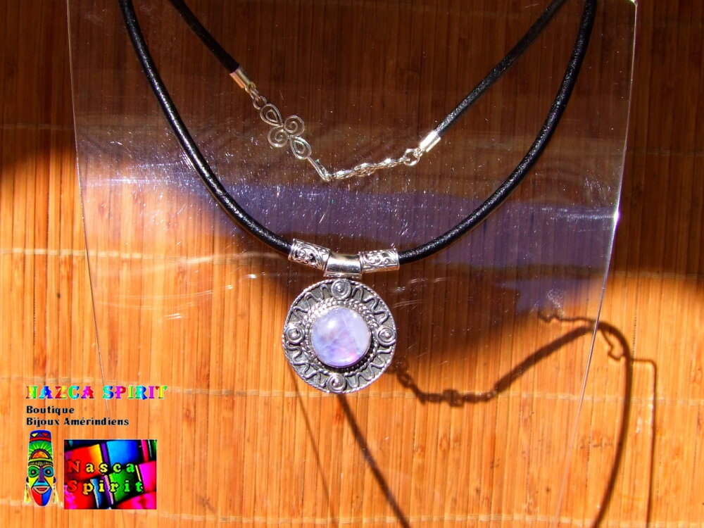 Collier Esprit Maya / Tour de cou en cuir / Pendentif Artisanal Rond Ouvragé Argent 925 et Pierre de Lune "Moonstone"