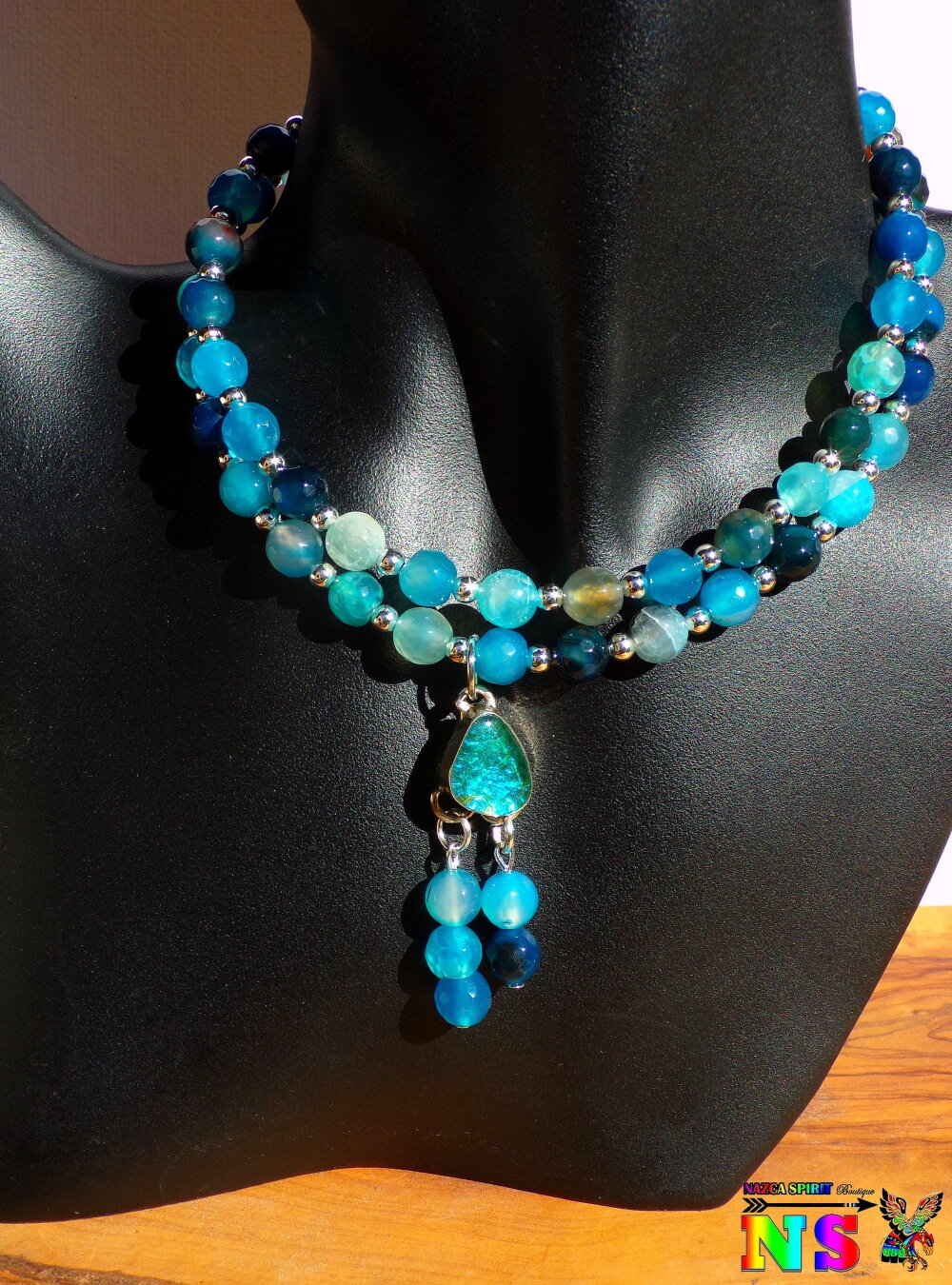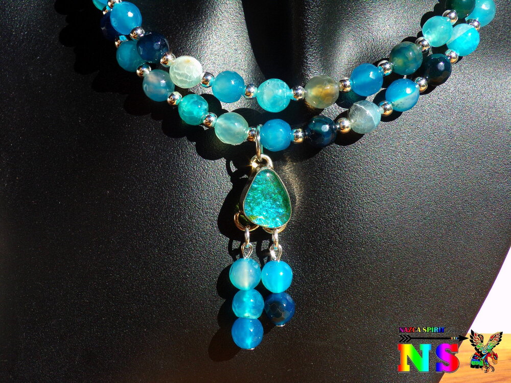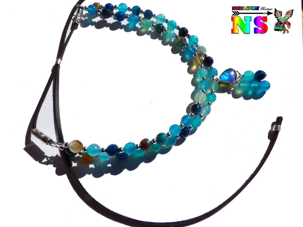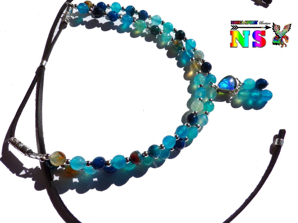 Matériaux : agates teintées (pierres fines origine : Inde), plaqué argent, daim suédé effet cuir, opale de synthèse, alliage tibétain, fil d'acier gainé