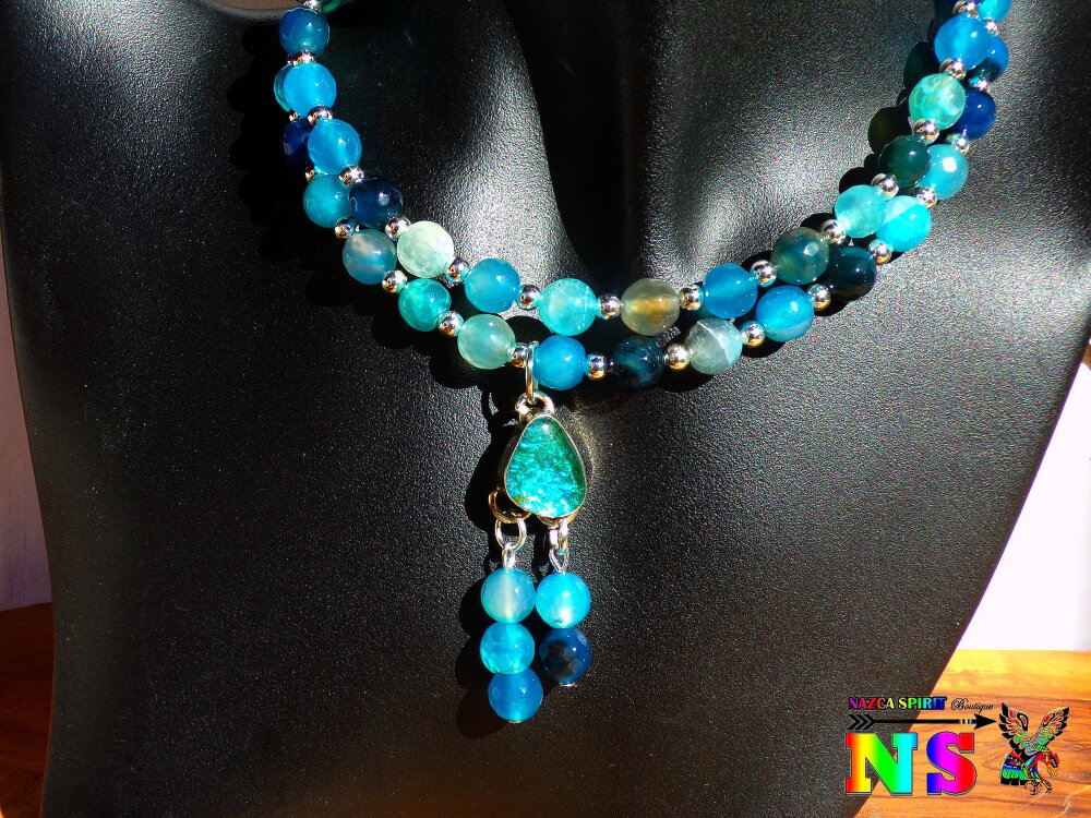 Collier ethnique ajustable en perles agates veine de dragon -Pierres agates facettées teintées -Perles bleu turquoise vert et bleu de Prusse