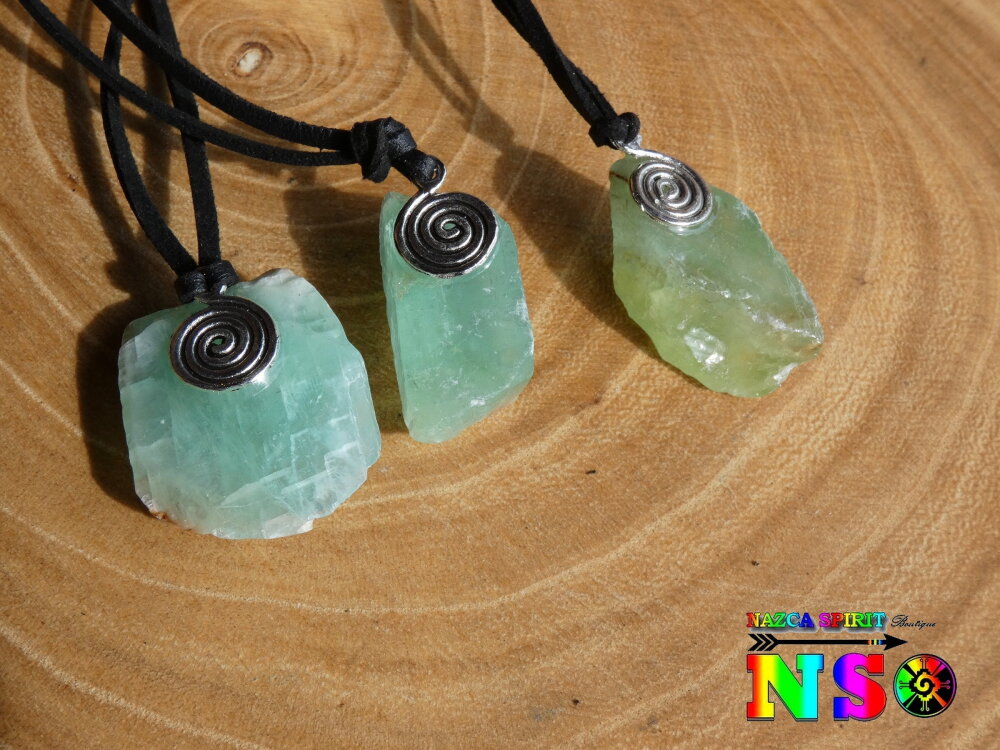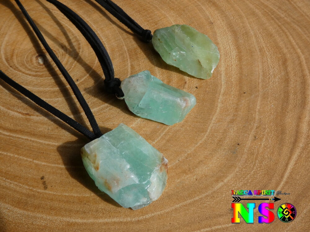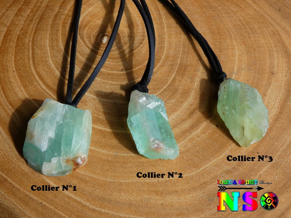 Ces colliers ont été réalisés à partir de véritable cristaux de calcite verte brute provenant du Mexique. Les thérapeutes spécialisés en lithothérapie conseillent à leurs patients de porter le cristal de calcite verte car il est réputé pour apporter des bienfaits thérapeutiques.