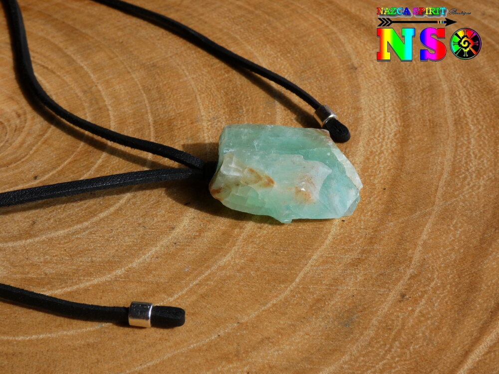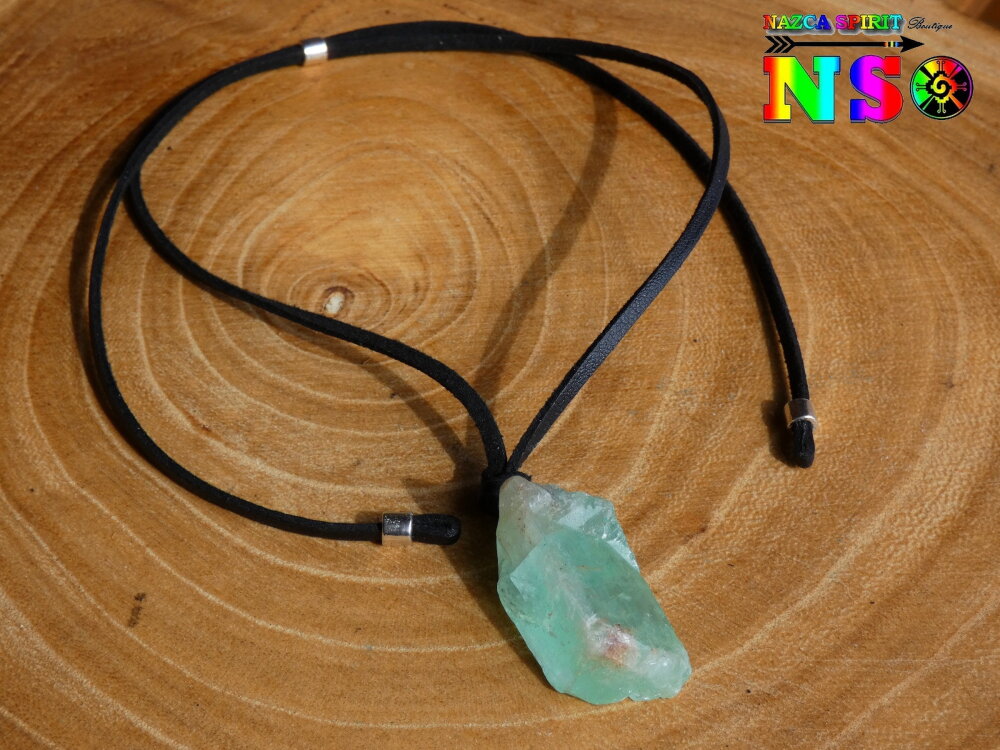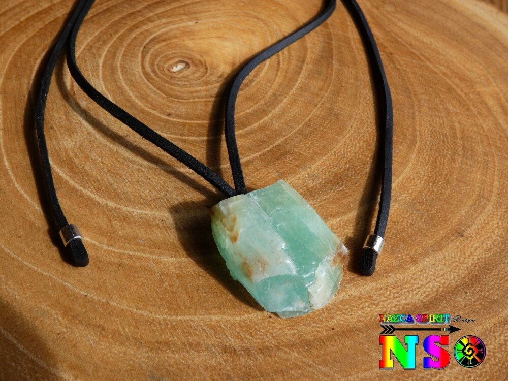 Matériaux : cristal de calcite verte (origine : Mexique), daim suédé effet finition cuir noir, alliage tibétain plaqué argent