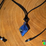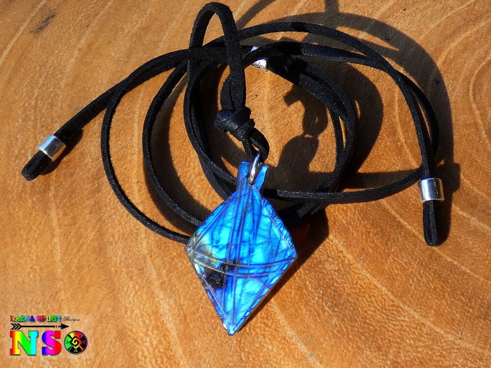 Matériaux : Pierre fine de labradorite (Origine : Pérou), daim suédé effet finition cuir, laiton plaqué argent