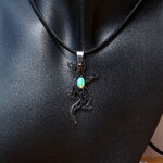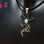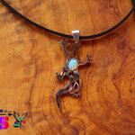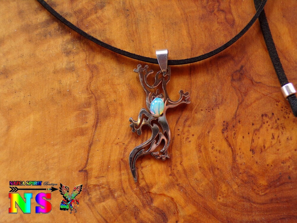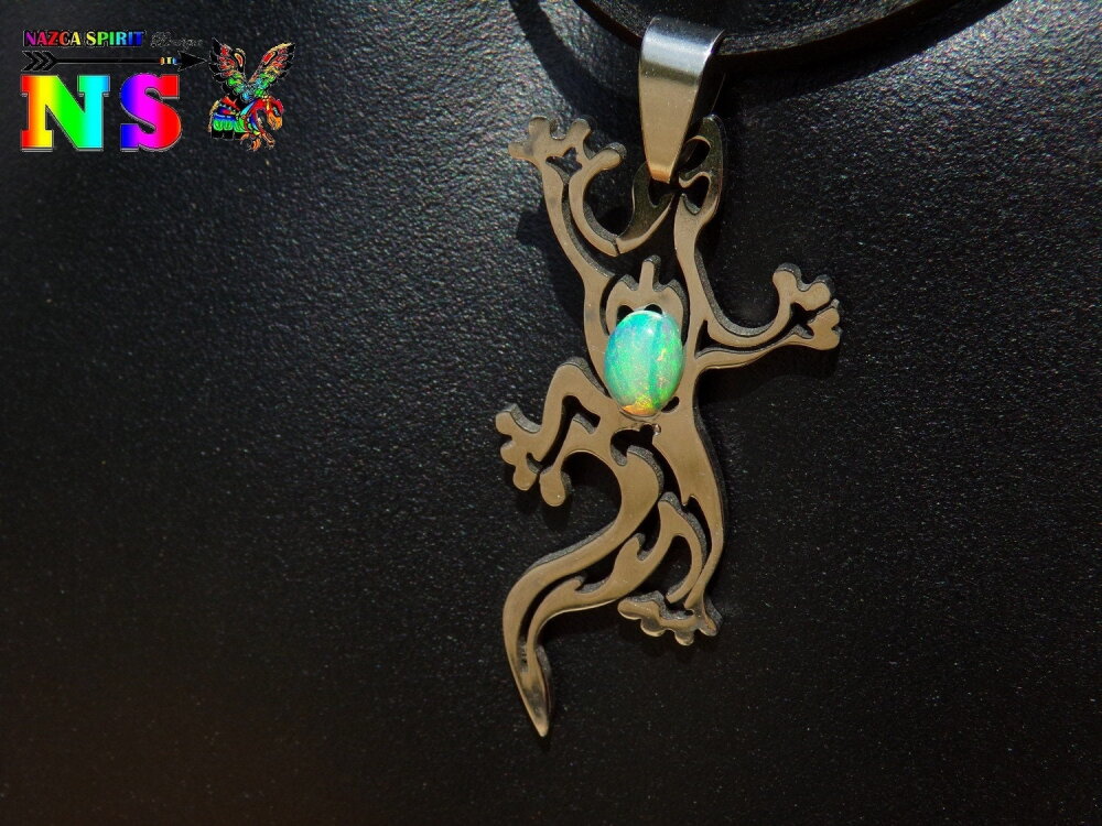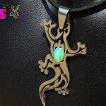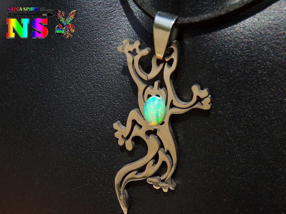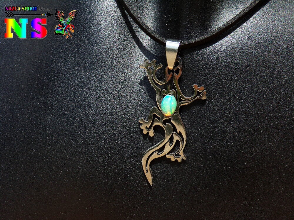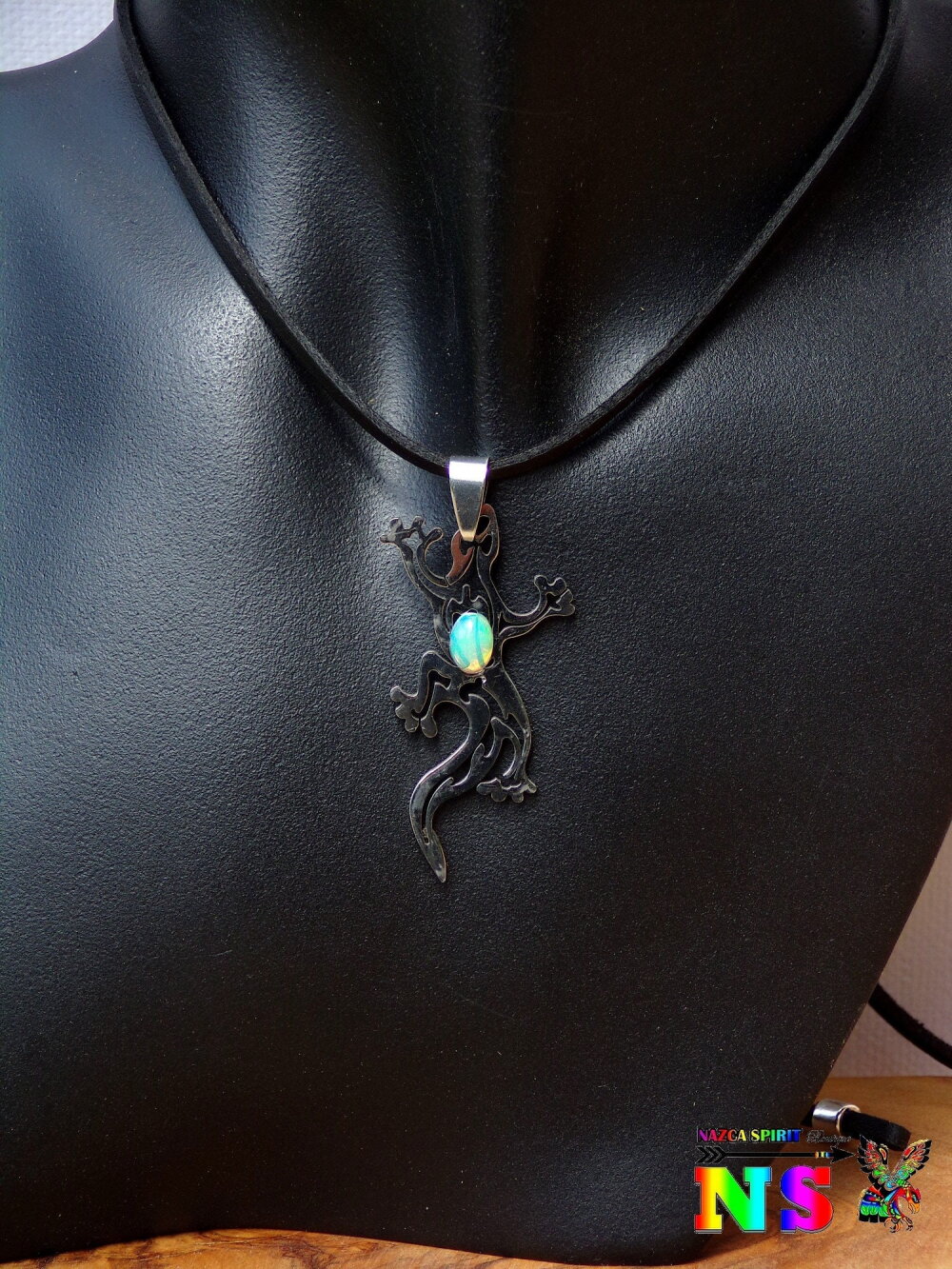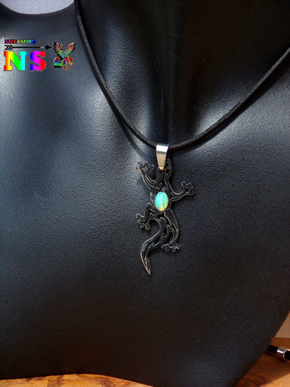 Collier ethnique ajustable - Pendentif gecko acier inoxydable -Bijou acier ciselé et cabochon opale australienne - création artisanale unique.