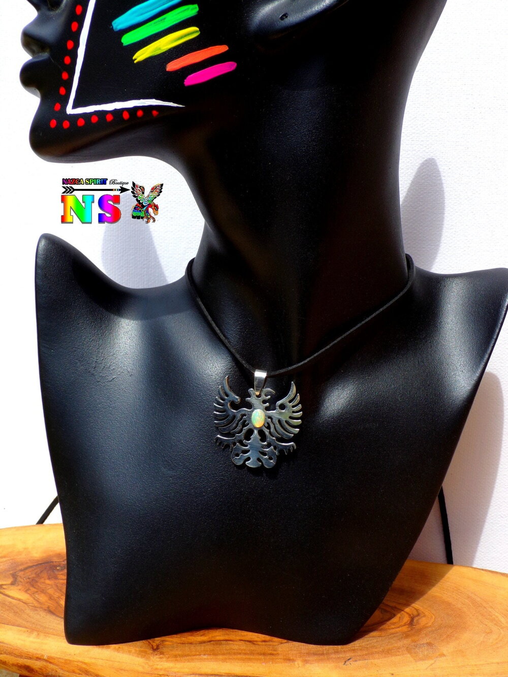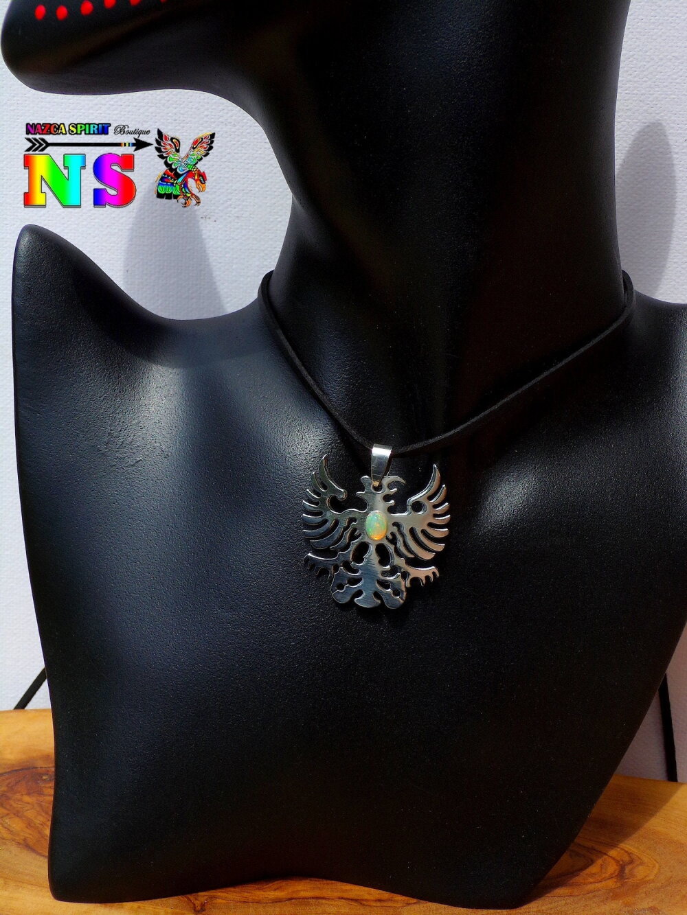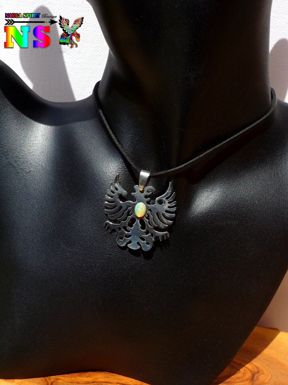 Collier Ethnique ajustable - Pendentif oiseau du tonnerre - Bijou acier ciselé et cabochon opale australienne - création artisanale unique.