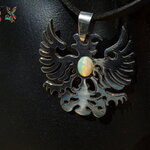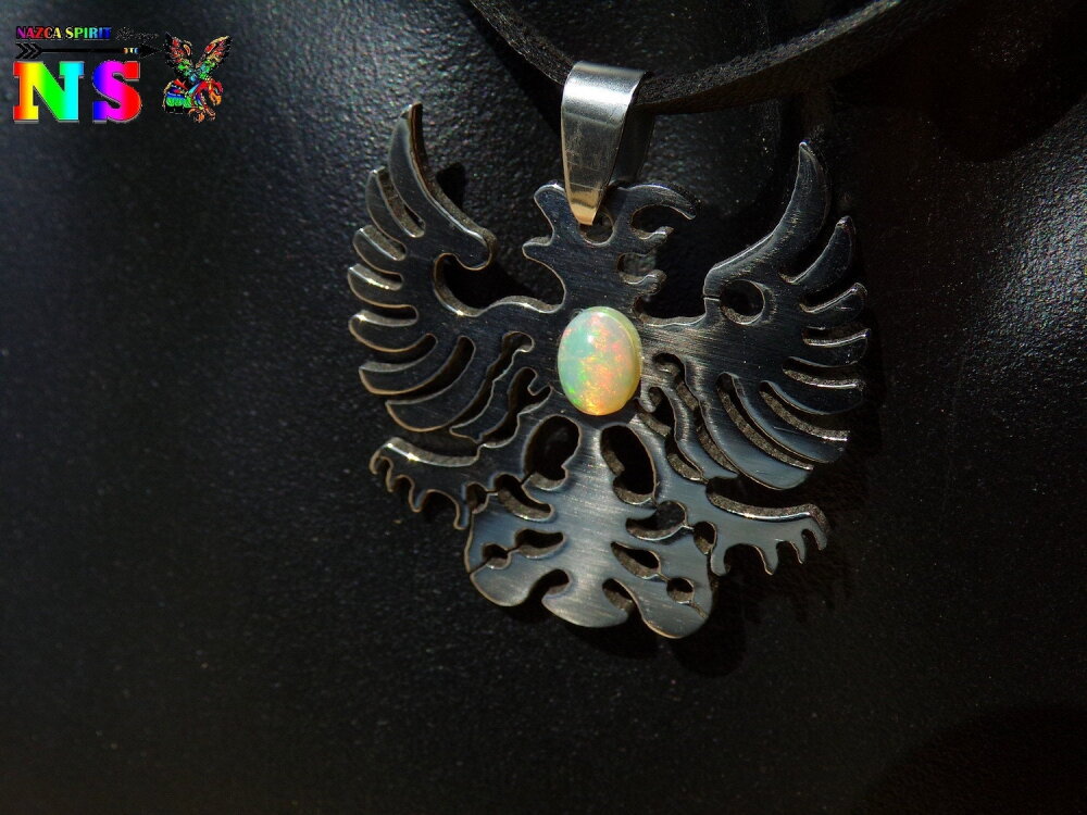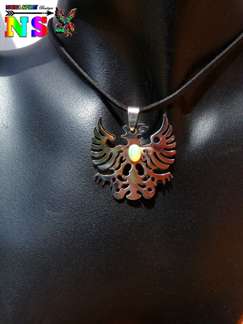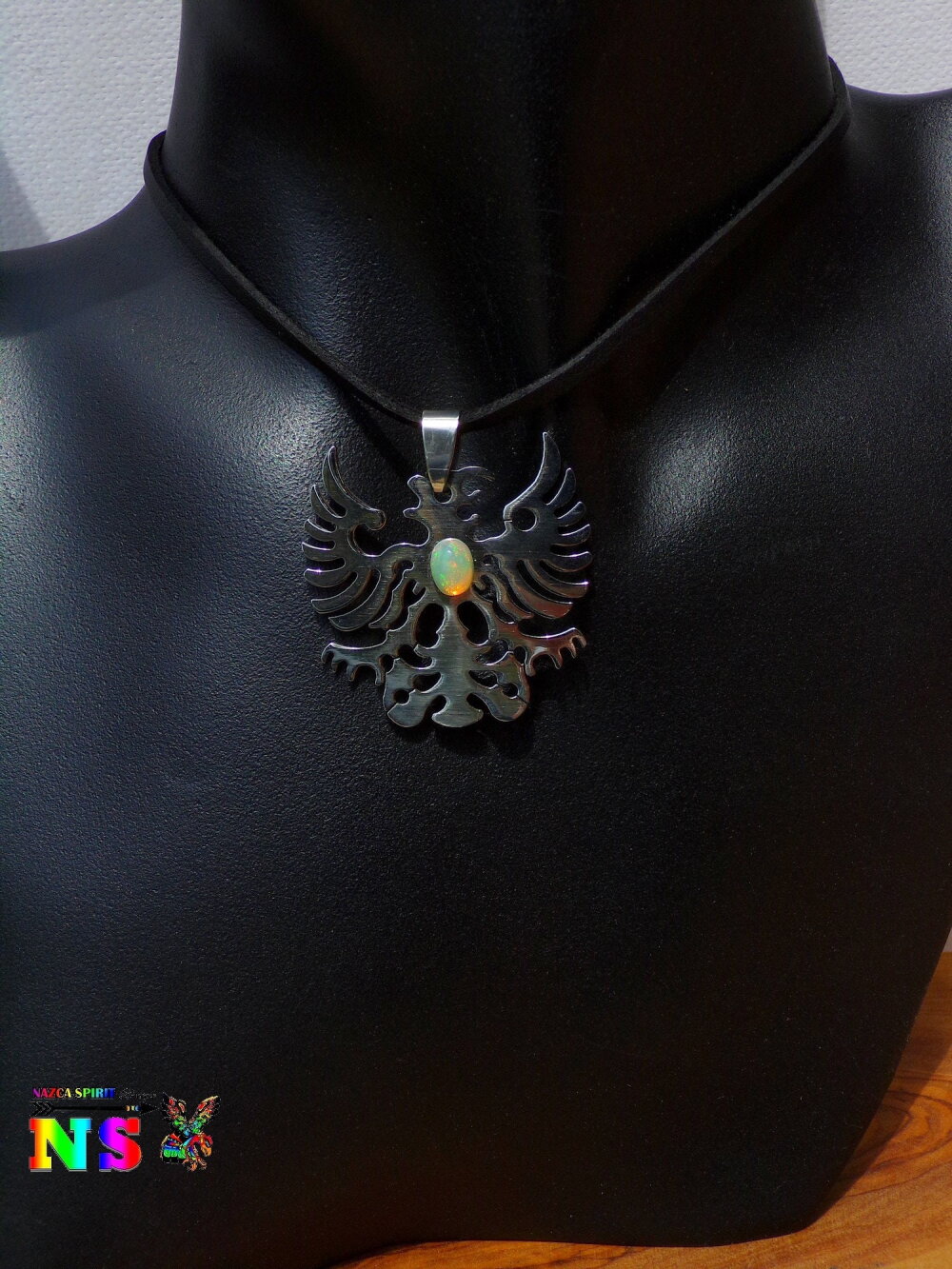 Collier Ethnique ajustable - Pendentif oiseau du tonnerre - Bijou acier ciselé et cabochon opale australienne - création artisanale unique.