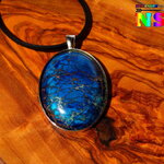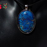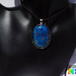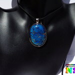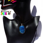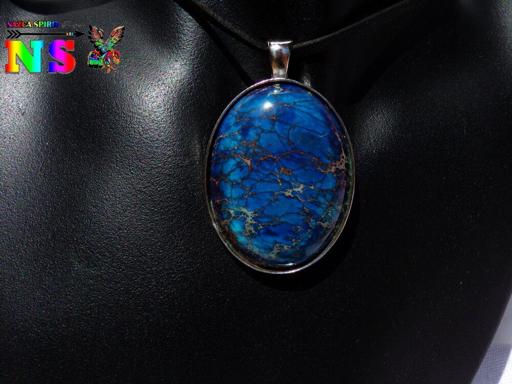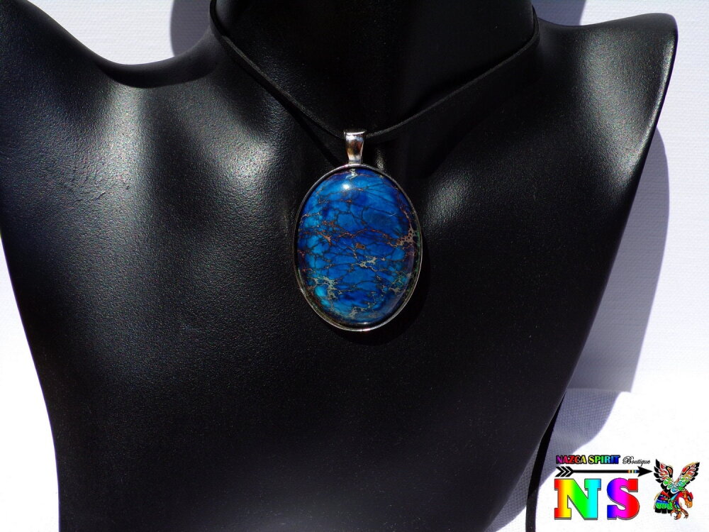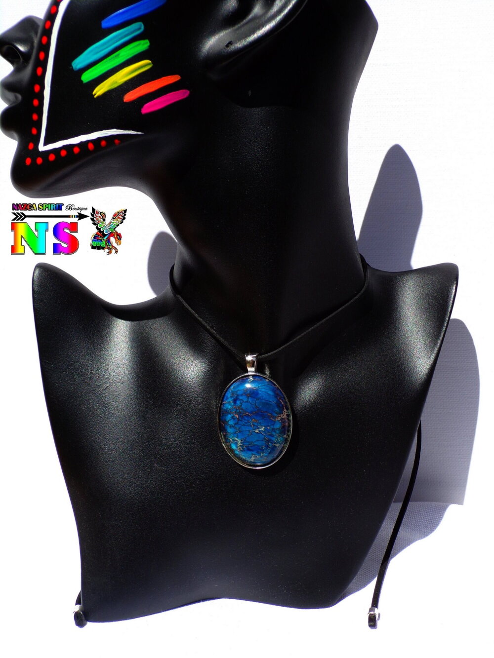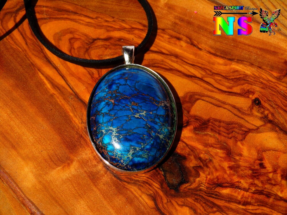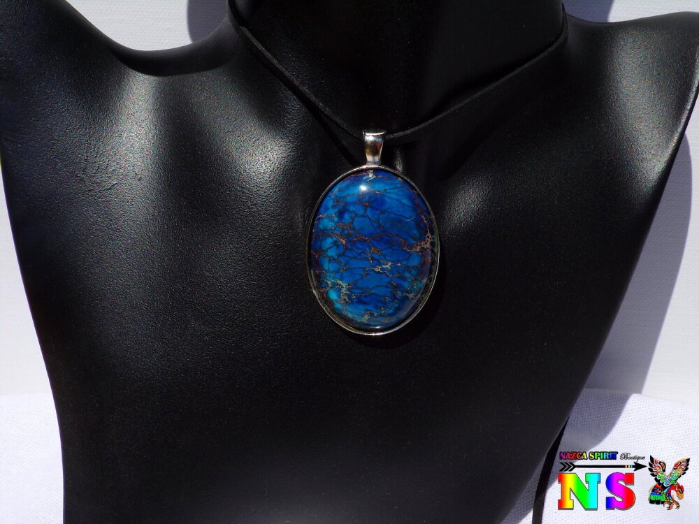 Je vous présente un superbe collier réglable de style bohème ethnique réalisé à partir d'un lacet en daim suédé noir effet cuir, d'un pendentif ovale en cuivre plaqué argent sur lequel j'ai serti un cabochon en Jaspe aquaterra forme ovale de superbe qualité qui a été poli puis teinté à l'aide de pigments naturels couleur Bleu Lapis.