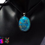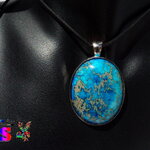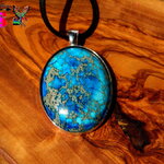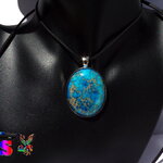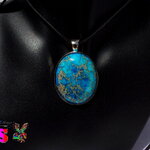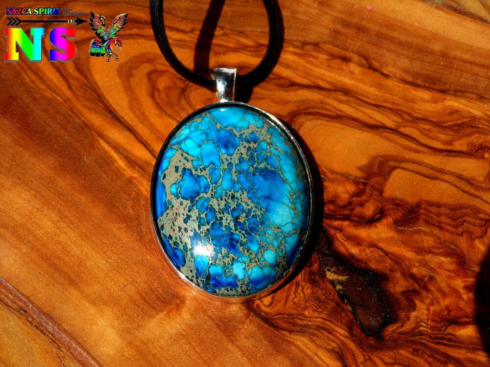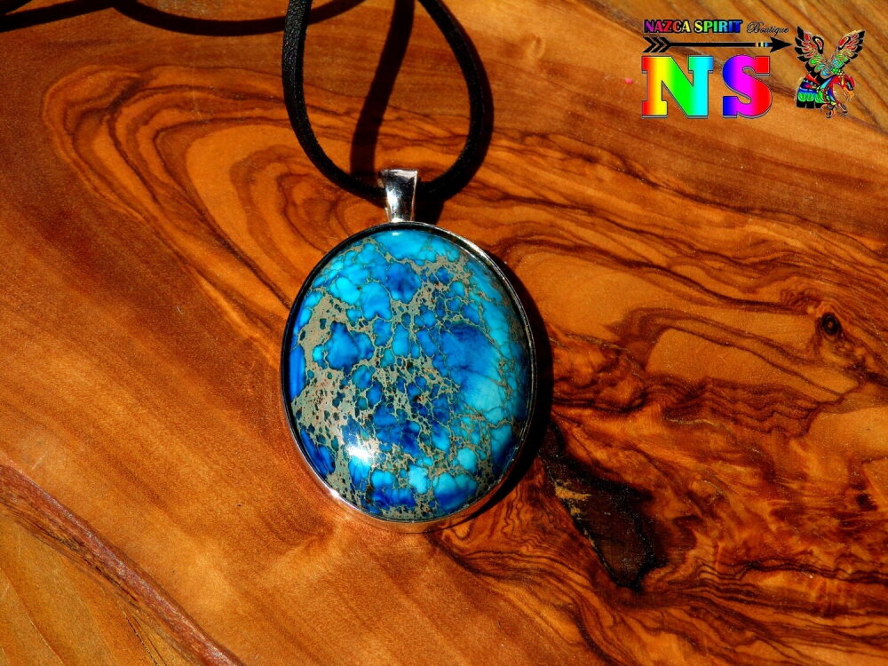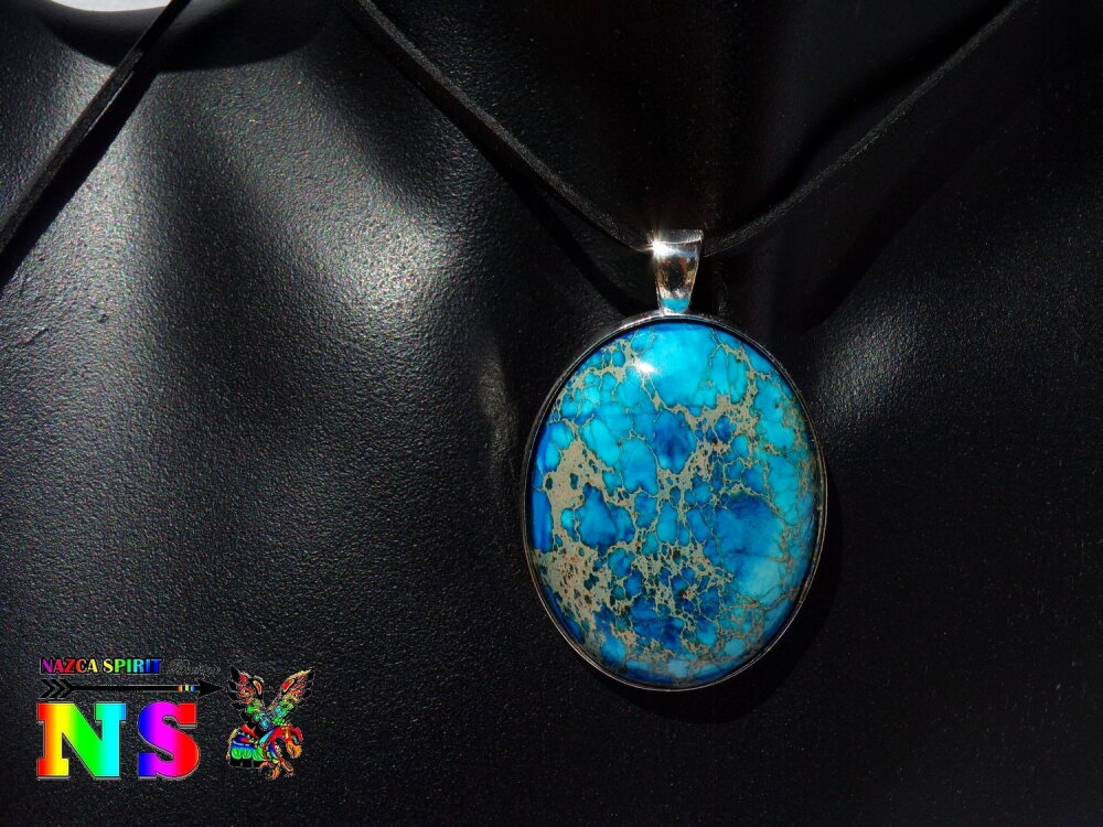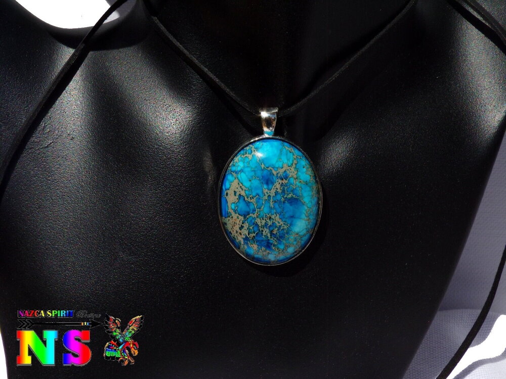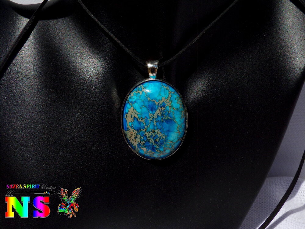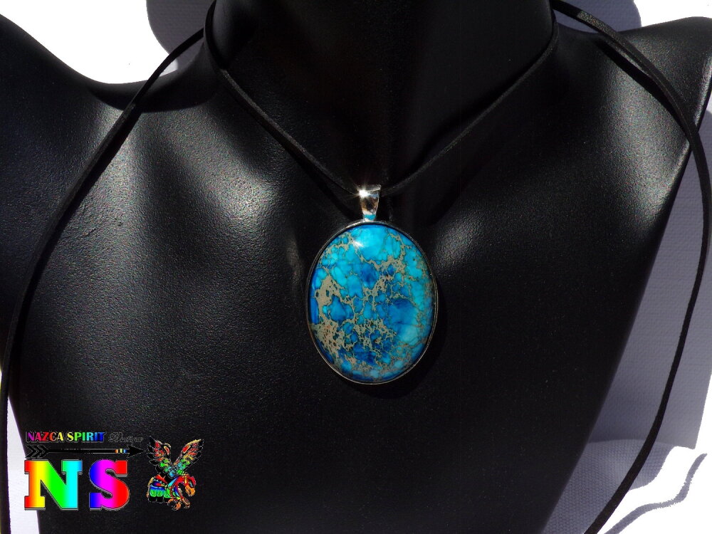 Je vous présente un superbe collier réglable de style bohème ethnique réalisé à partir d'un lacet en daim suédé noir effet cuir, d'un pendentif ovale en cuivre plaqué argent sur lequel j'ai serti un cabochon en Jaspe aquaterra forme ovale de superbe qualité qui a été poli puis teinté à l'aide de pigments naturels couleur Bleu Turquoise.