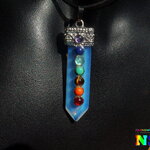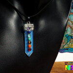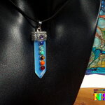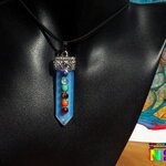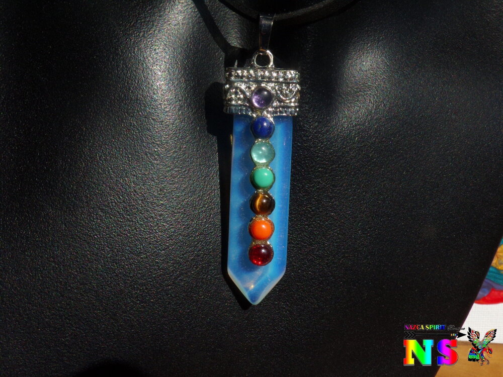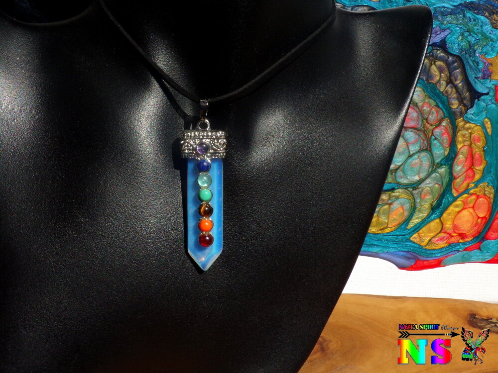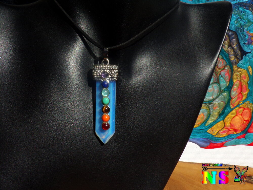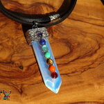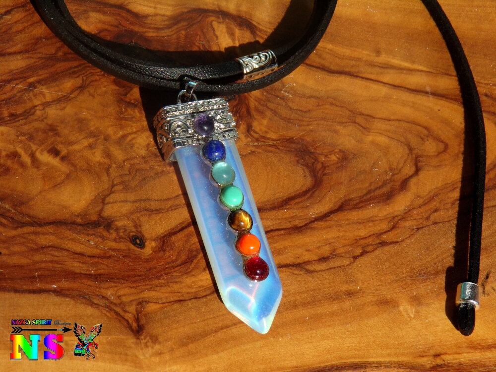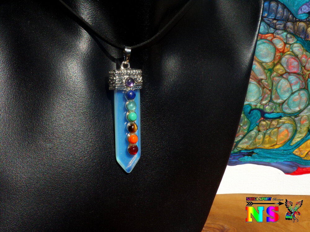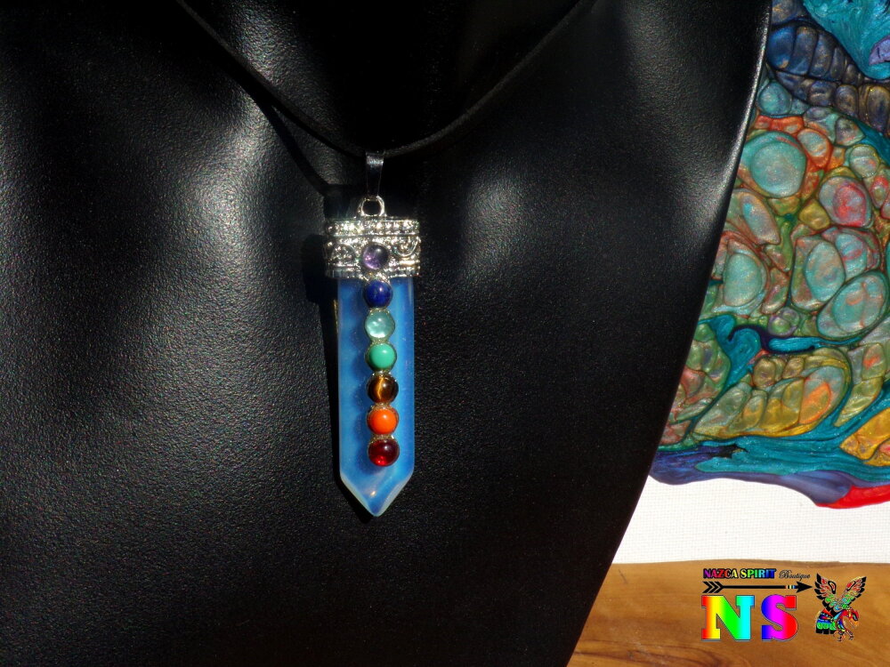 Je vous propose un collier ajustable en daim suédé effet cuir sur lequel est suspendu un superbe pendentif esprit zen en opaline bleu opalescent en forme de pointe sur lequel ont été serties des petits cabochons ronds en pierres fines représentant les 7 chakras.
