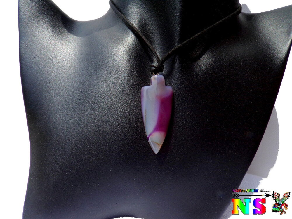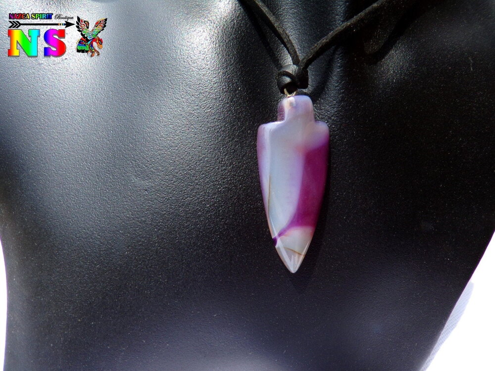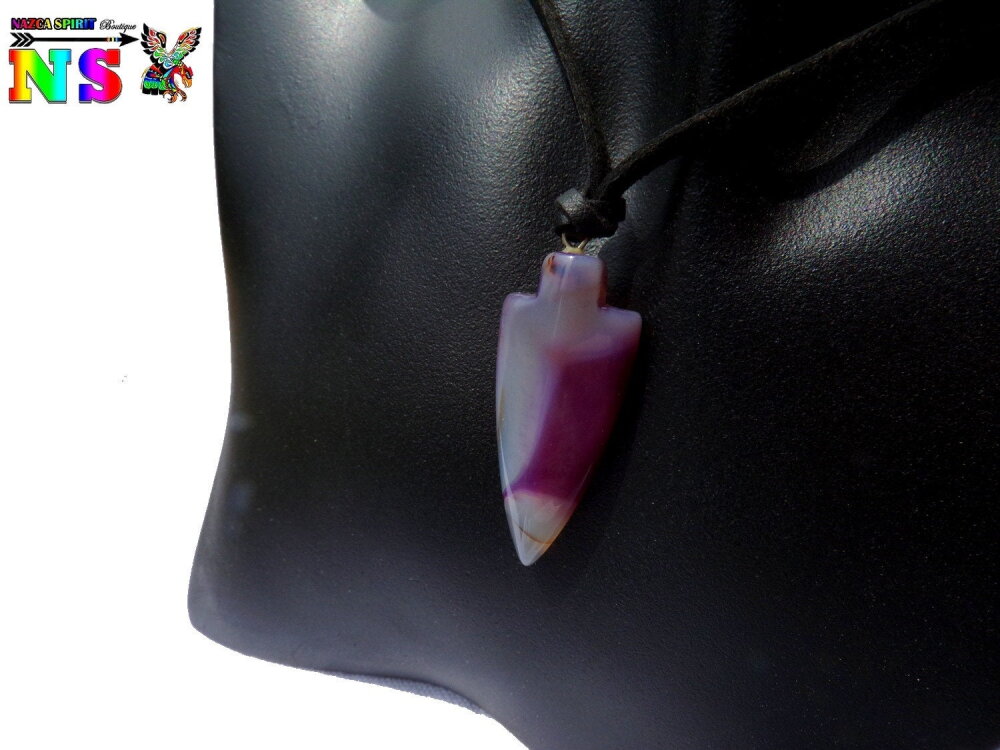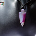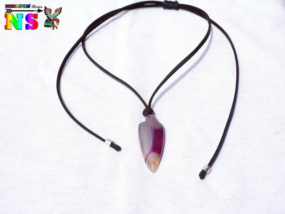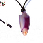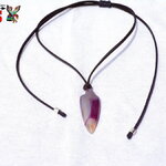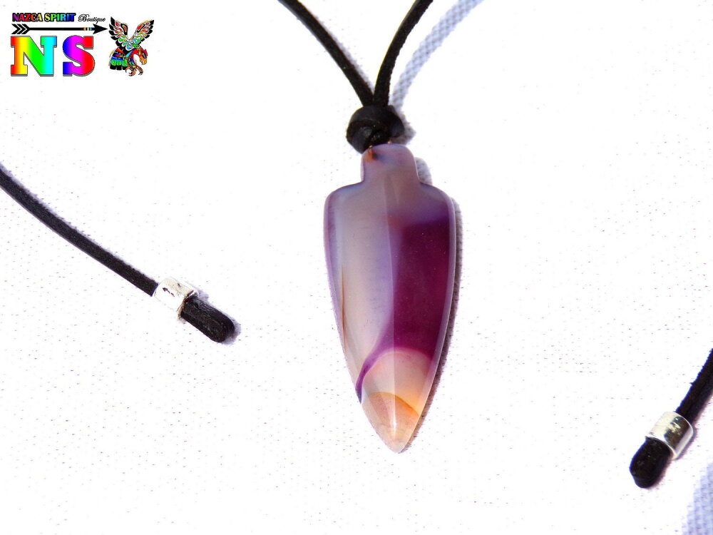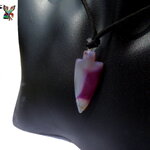 Collier Ethnique Réglable - Pendentif Flèche Sculptée en Agate - Agate Enrubannée Couleur Mauve Foncé et Mauve Clair - Création Unique