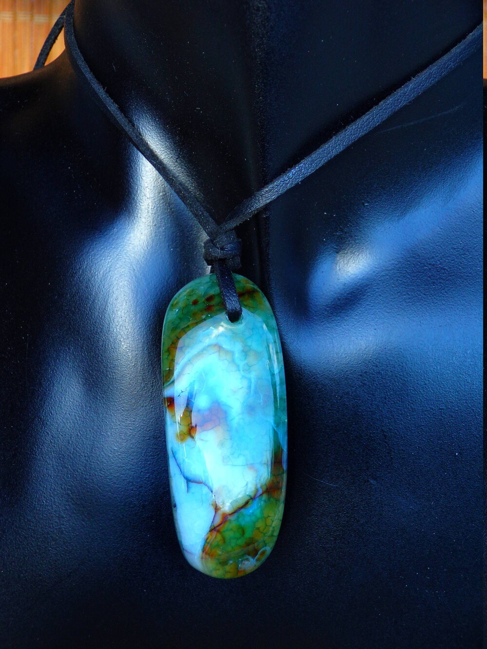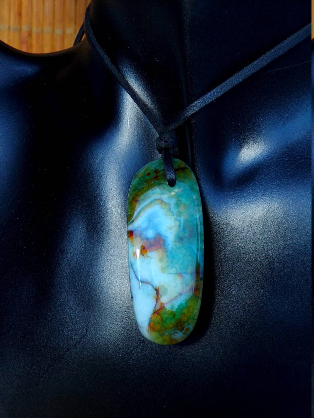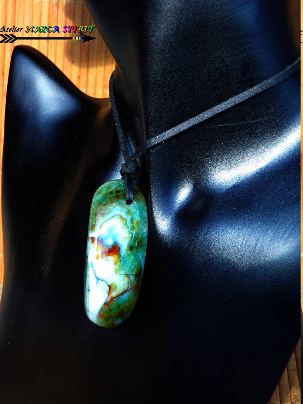 Collier Ethnique Tour de Cou Réglable Suédine Effet Cuir Noir et Pendentif Forme Libre Pierre en Agate Veine de Dragon Naturelle 4 Faces.