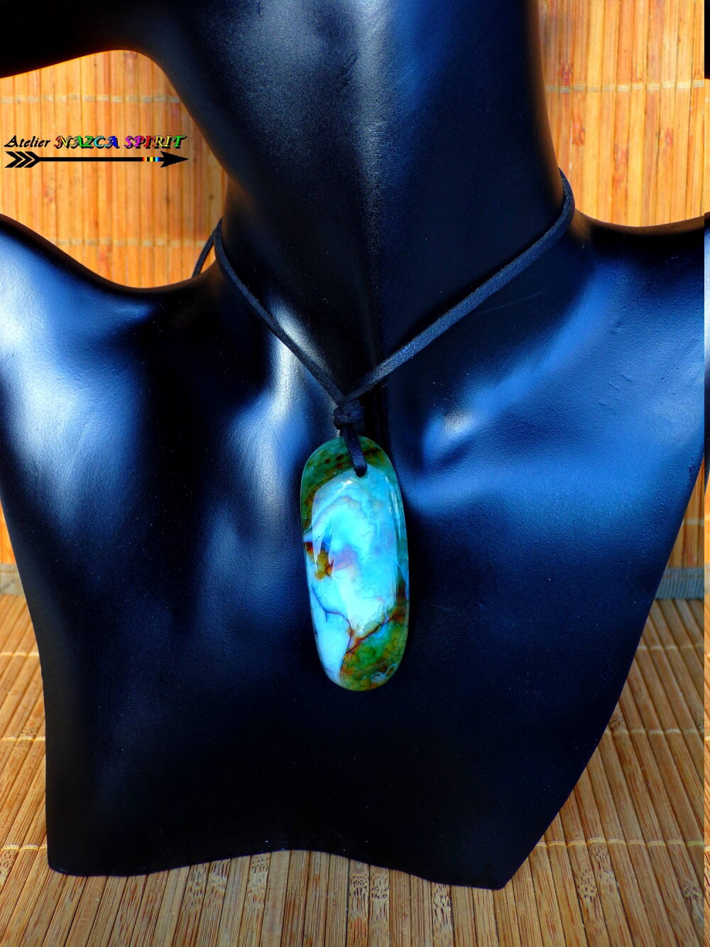 Les 4 facettes présentent des détails de couleurs et de motifs très différents selon le positionnement de la pierre (voir photos sur la fiche du collier).
