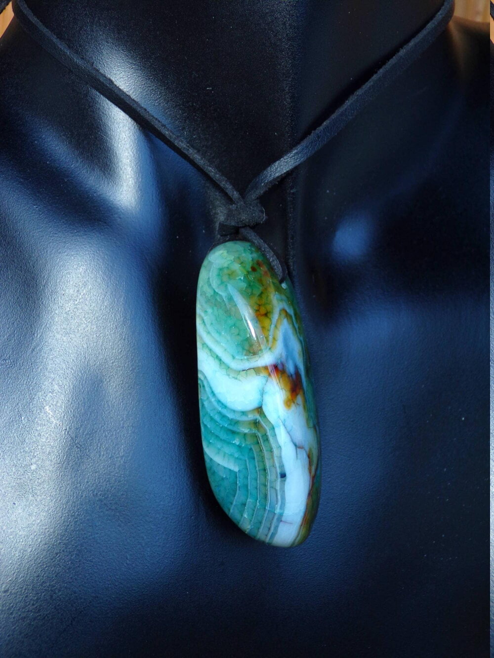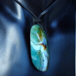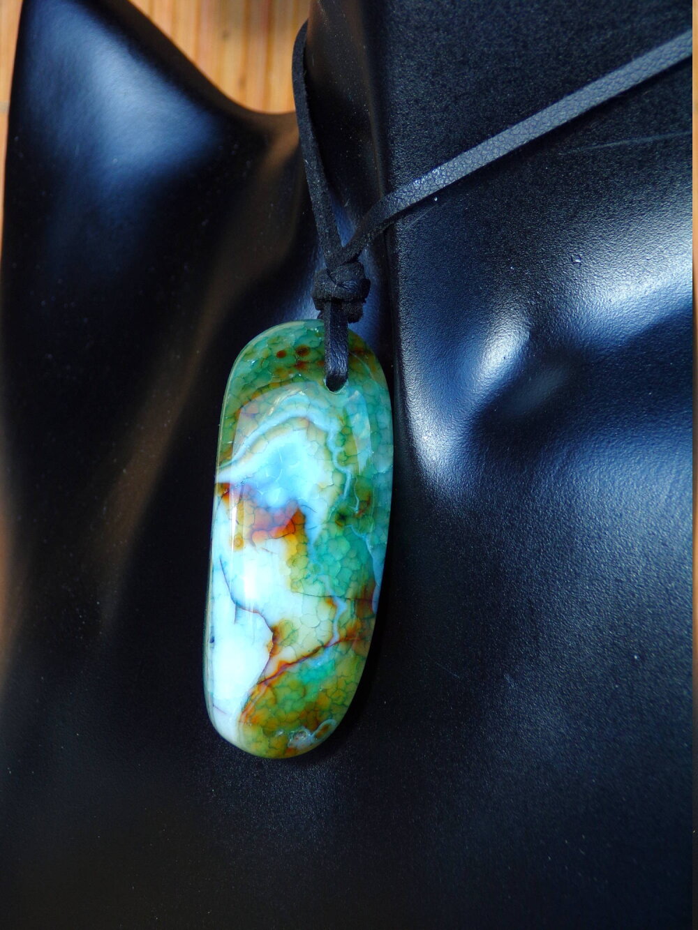 J'ai réalisé ce collier d'inspiration ethnique à l'aide d'un lacet suédine effet cuir noir et d'une magnifique agate forme libre possédant 4 côtés. Il s'agit d'une superbe pierre taillée de 4 facettes avec finition polie brillante.
