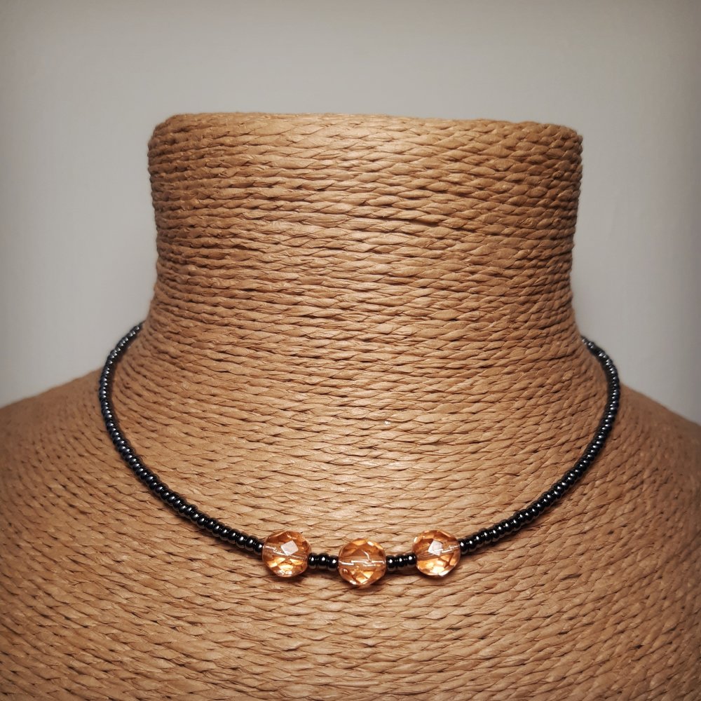 Collier en perles de rocailles Miyuki jet hématite avec perles en verre pêche. Fermoir à ressort en acier inoxydable.