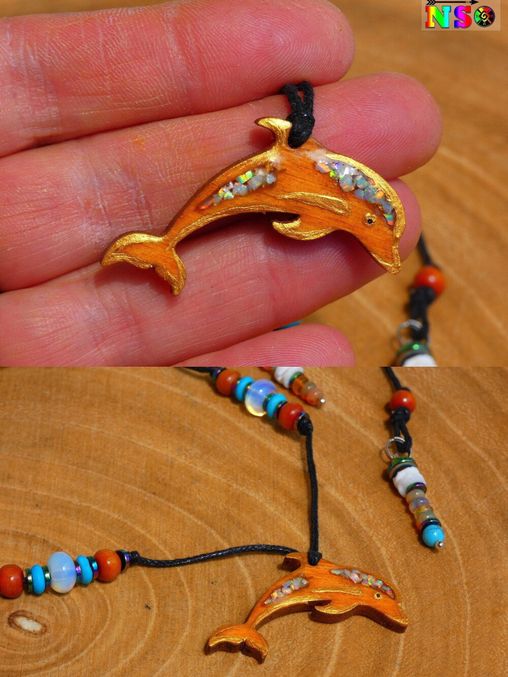 J'ai ensuite creusé une partie de l'intérieur du pendentif dauphin à l'aide de ma Drémel et j'ai inséré des morceaux d'opales de feu dans la partie creusée puis j'ai ajouté des effets relief à l'aide de peinture acrylique or puis j'ai recouvert le tout d'une couche de résine de finition afin de protéger à la fois le bois ainsi que les opales.