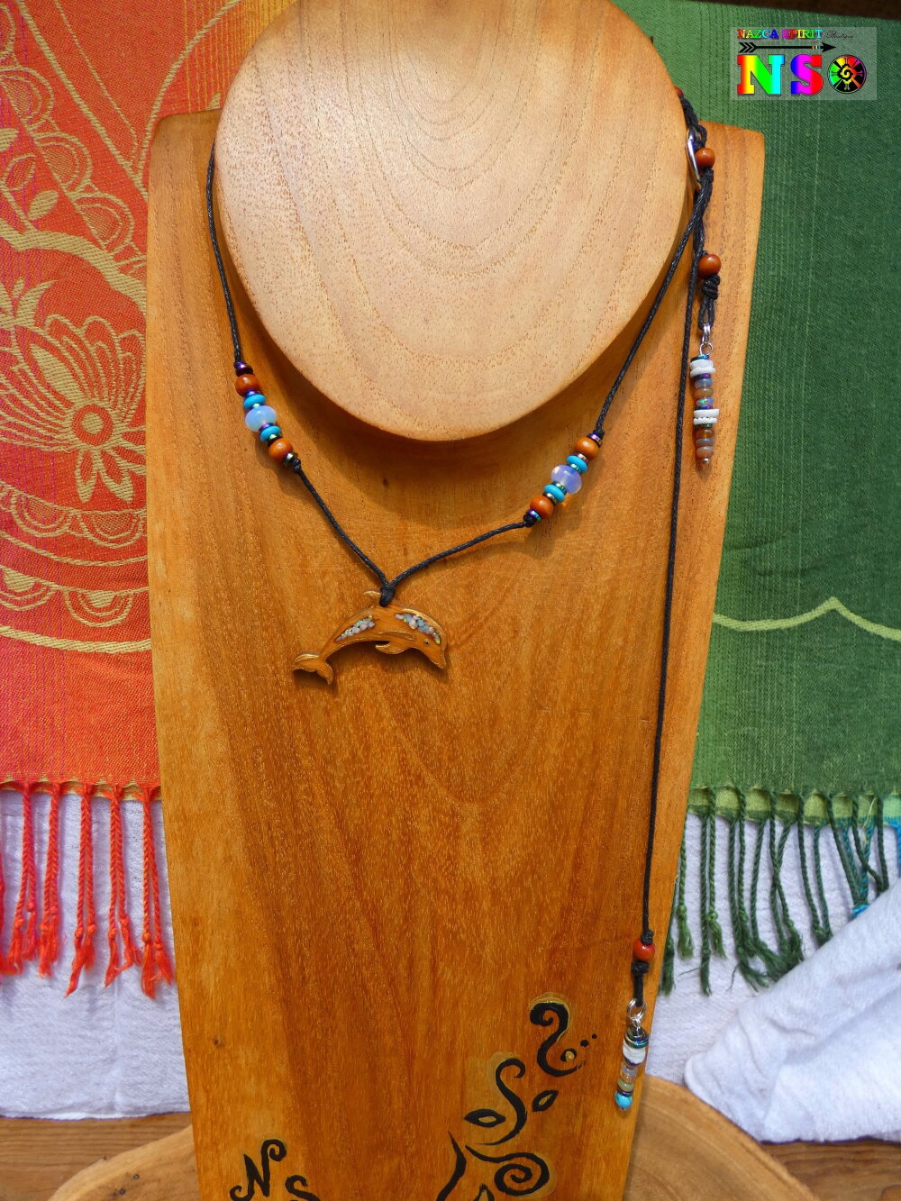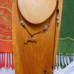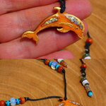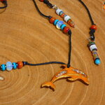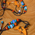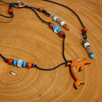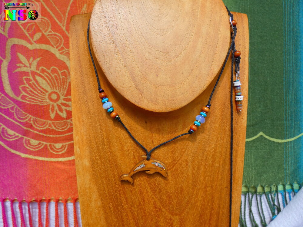 Au bout du tour de cou j'ai relié un pendentif en forme de dauphin découpé dans du bois d'Eucalyptus qui provient de chez moi (nous possédons deux grands eucalyptus dans notre jardin). Le dauphin en bois a été ensuite poli, puis teinté à l'aide de pigments naturels couleur havane qui est produit dans le Vaucluse en Provence où mon atelier est situé depuis 2013.
