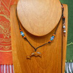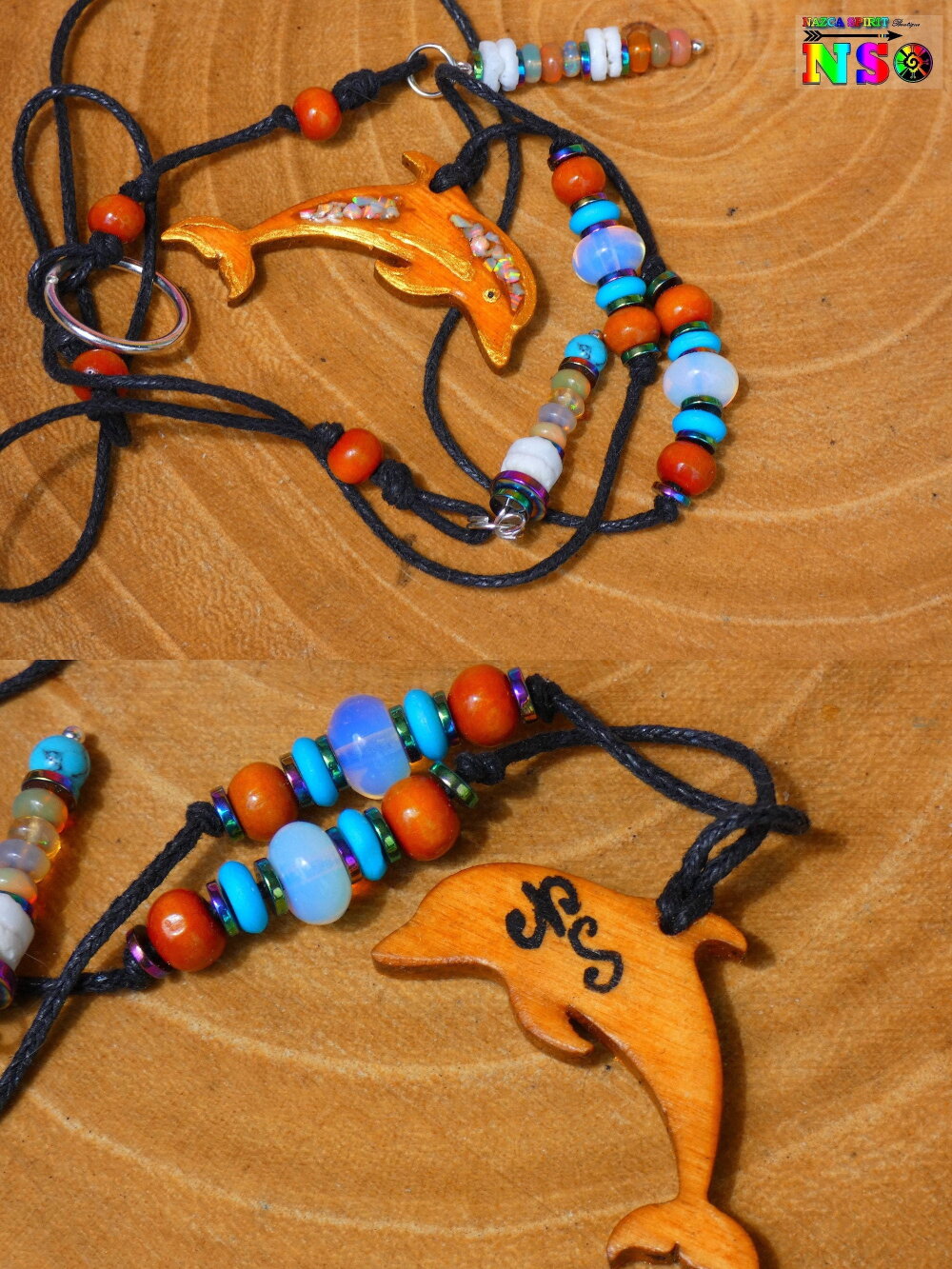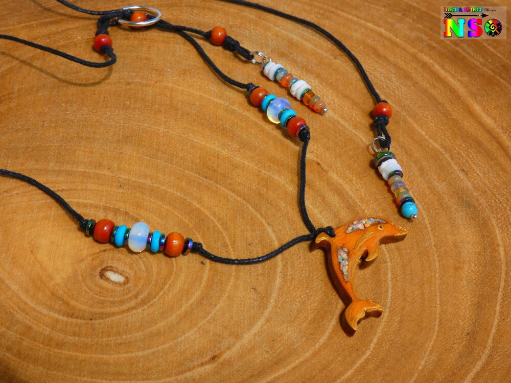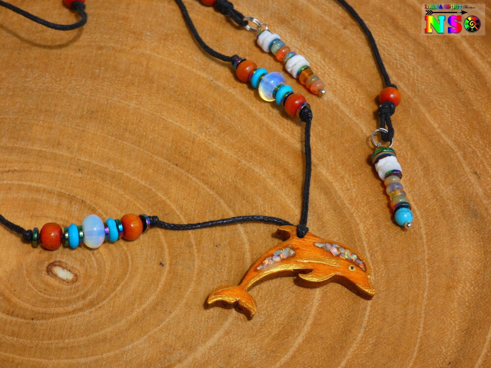 Collier Lasso Ajustable Pendentif Dauphin en Bois Ciselé et Opales de Feu - Bijou Artisanal Thème Australie -Création Multicolore Iridescent