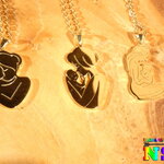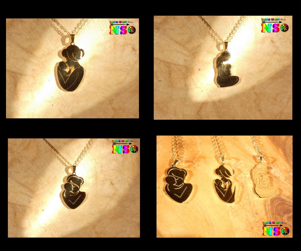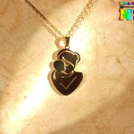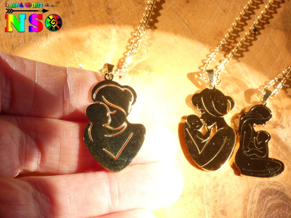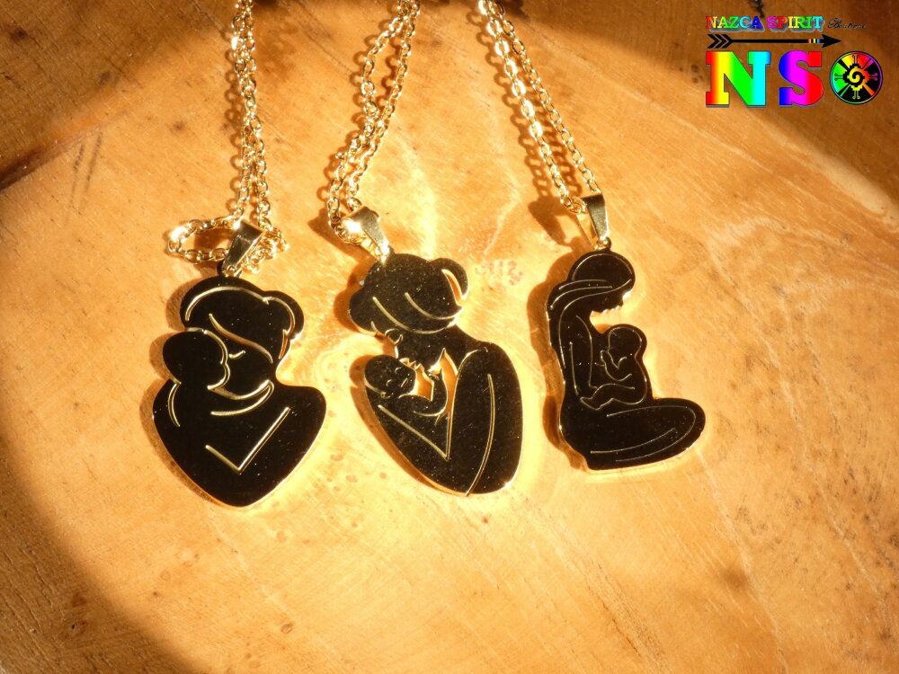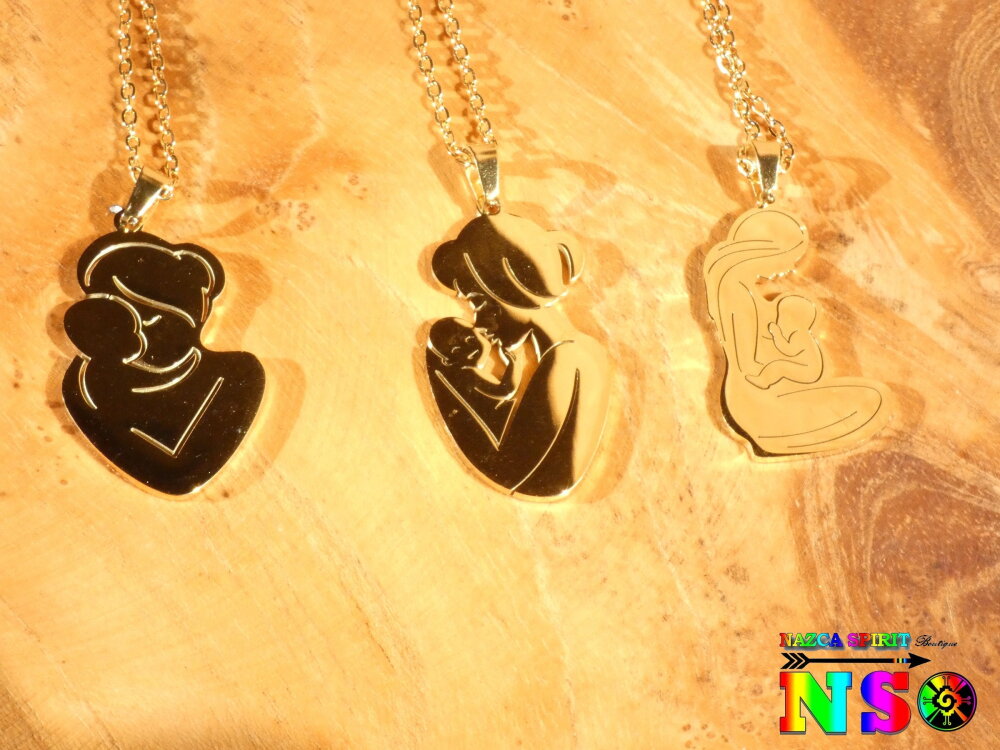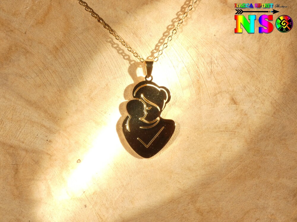 Le bijou est composé d'une très belle chaîne en acier inoxydable plaqué or 18k sur laquelle est suspendu un magnifique pendentif représentant une maman et son bébé. Le pendentif a été réalisé à partir d'une plaque d'acier inoxydable découpée au laser.