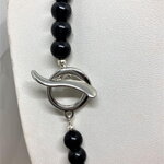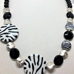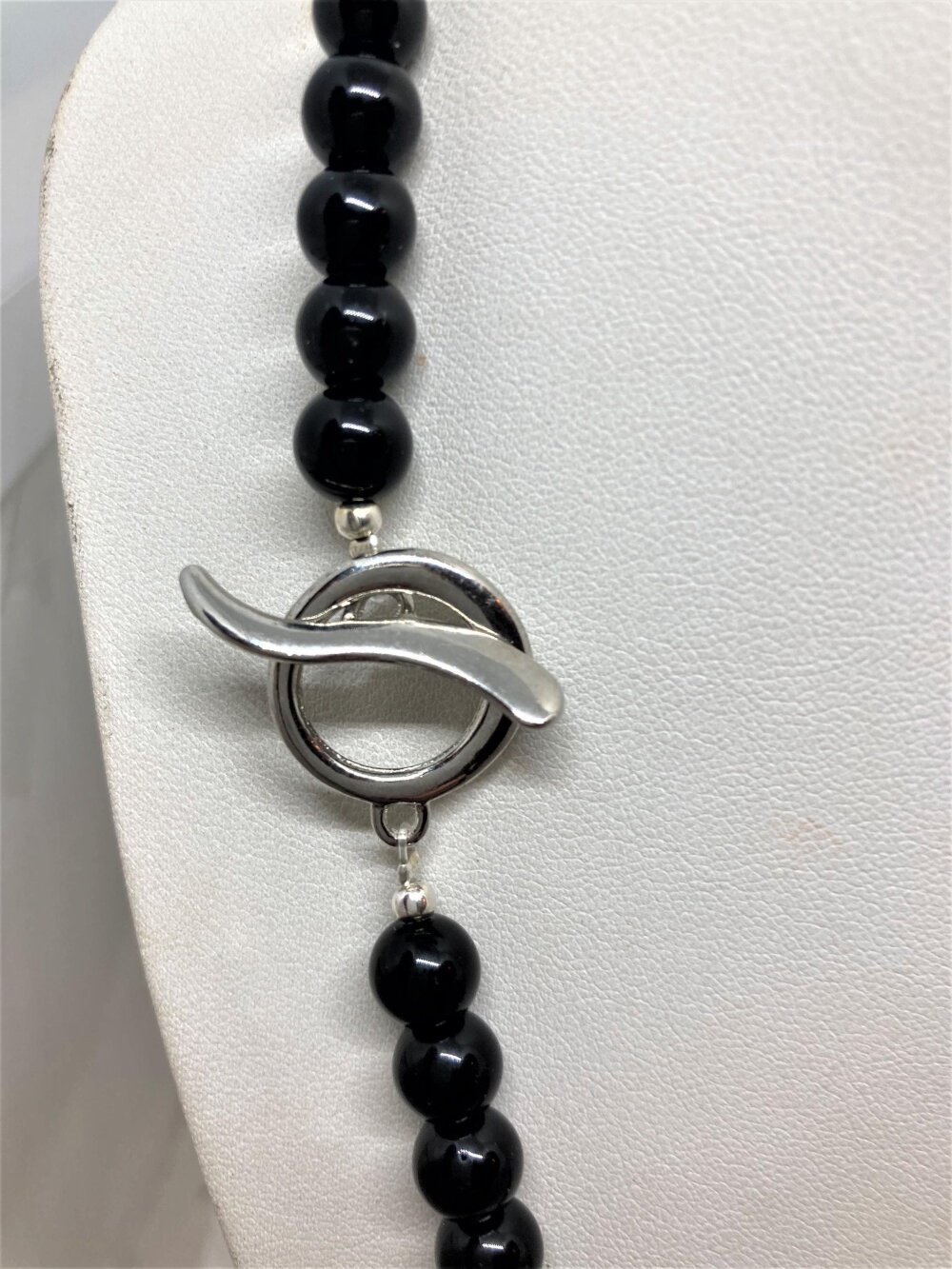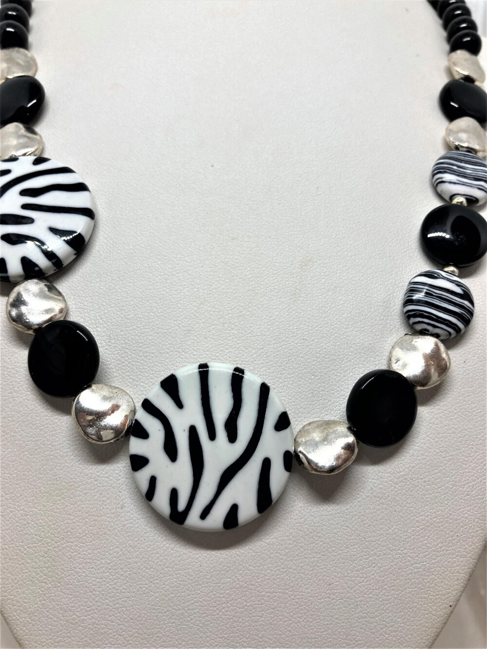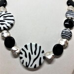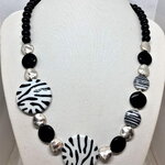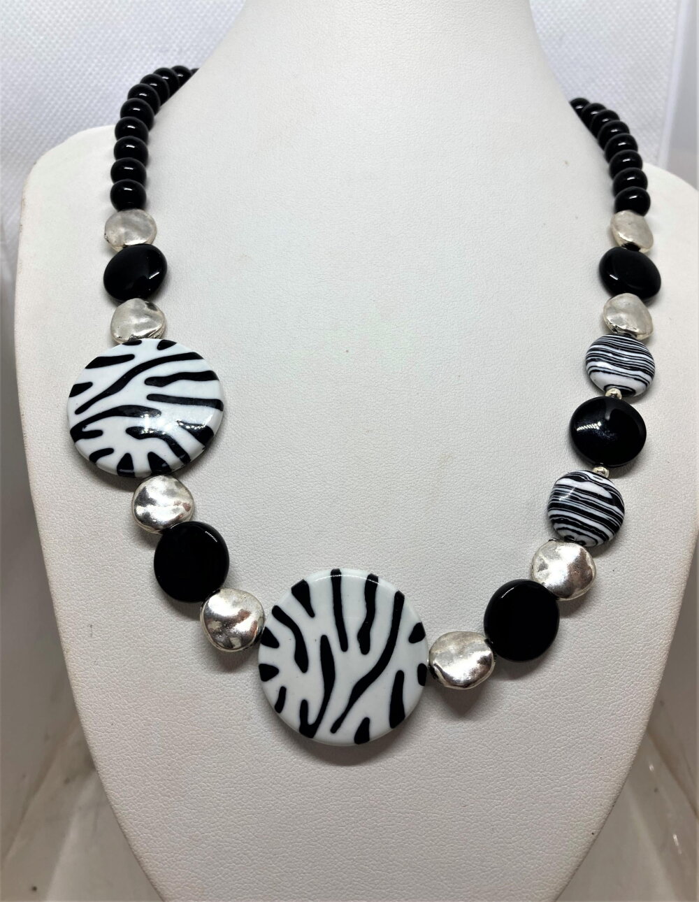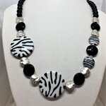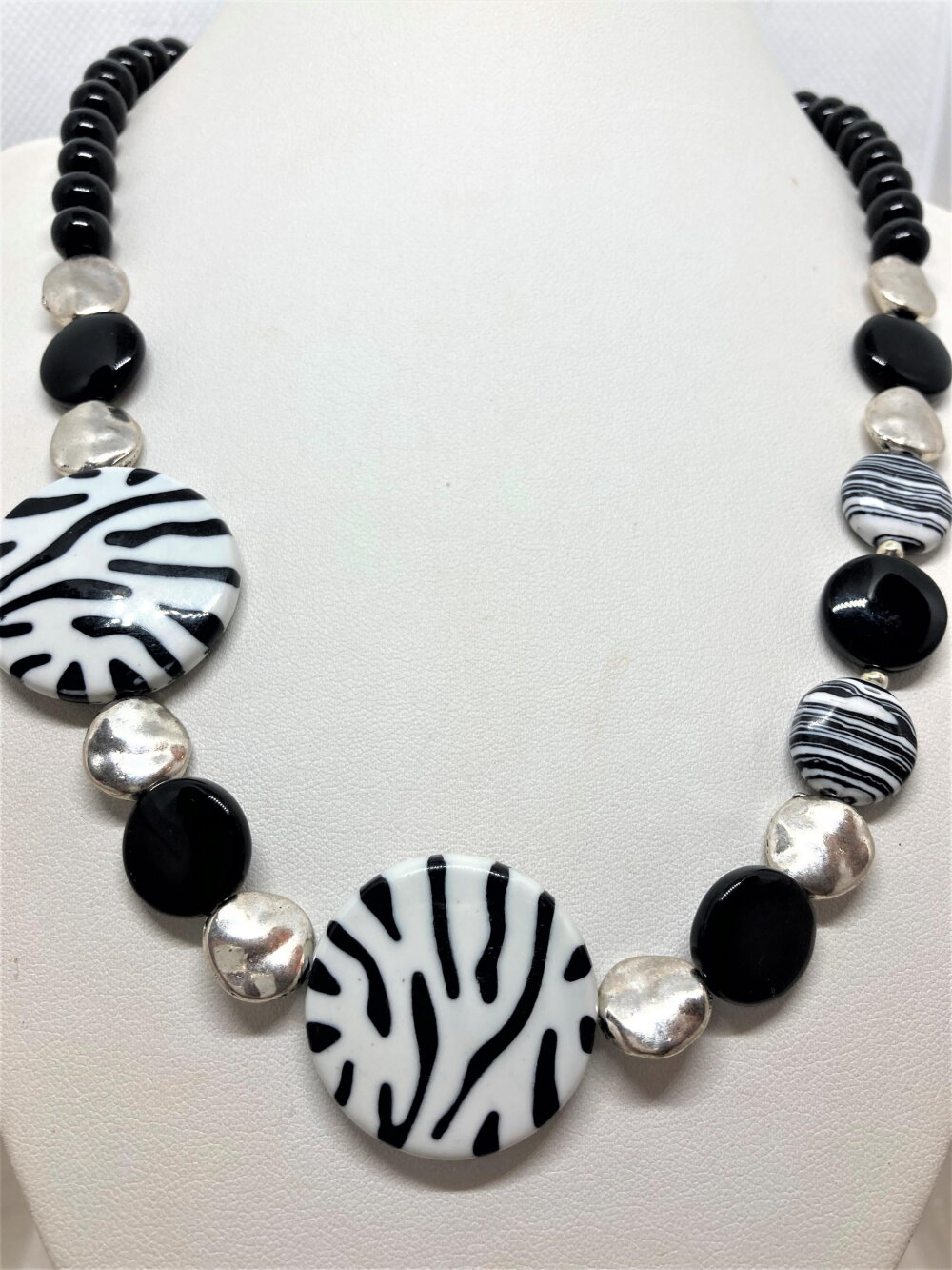 2 grosses perles plates en céramique "placées" . Des perles rondes plates en onyx et en howlite, terminé par des perles rondes en onyx noir de 8mm.