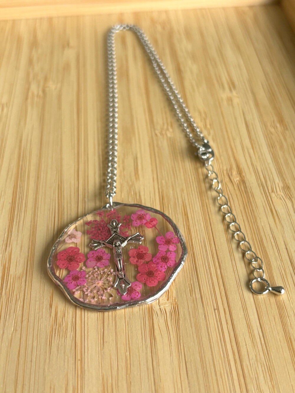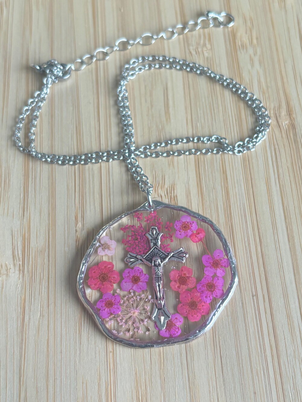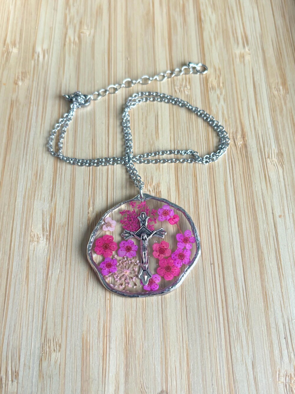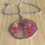 Collier pendentif argenté, pendentif religieux fleuris, pendentif fleurs séchées, pendentif croix fleurs, pendentif fleurs roses, cadeaux