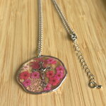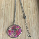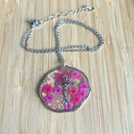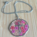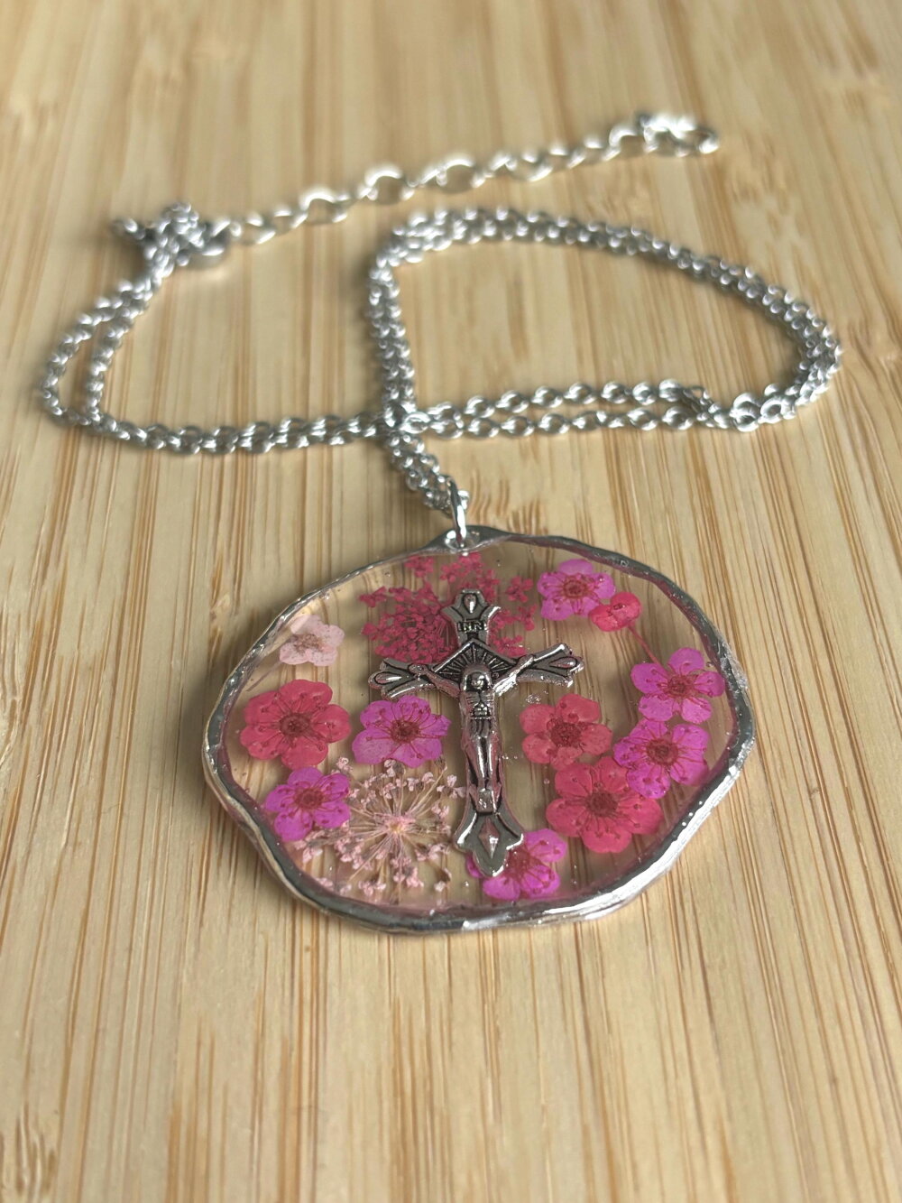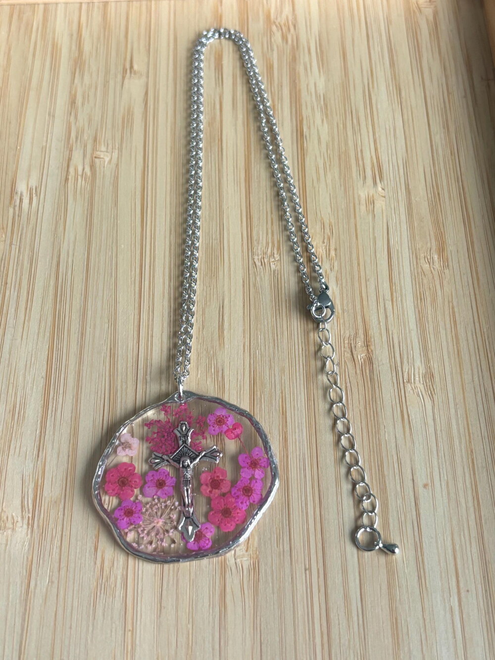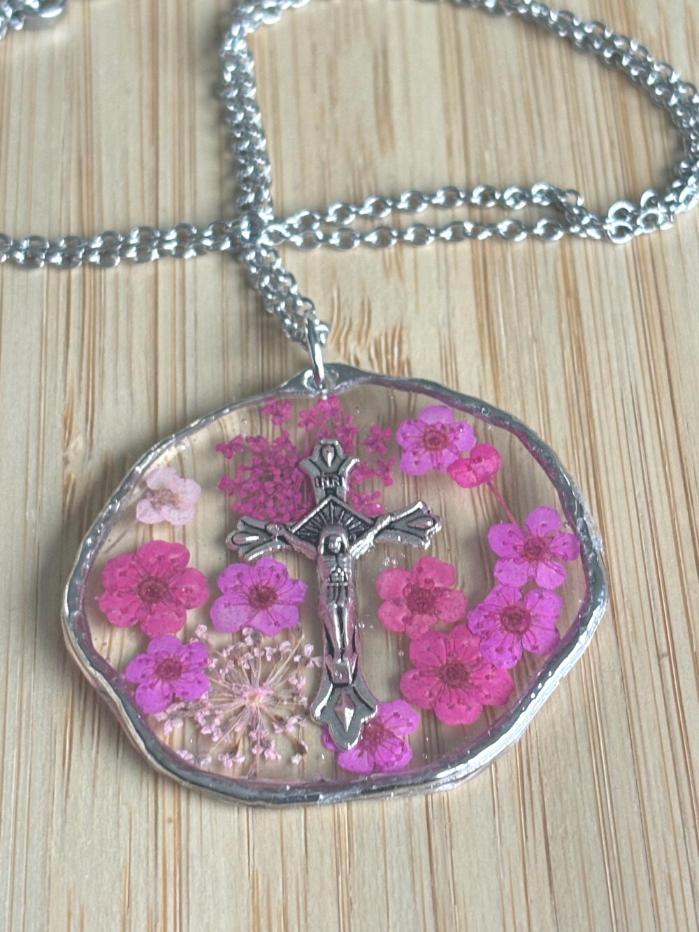 Collier pendentif argenté, pendentif religieux fleuris, pendentif fleurs séchées, pendentif croix fleurs, pendentif fleurs roses, cadeaux
