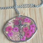 Collier avec en pendentif une croix Chrétienne entourée de véritables fleurs séchées et pressées.