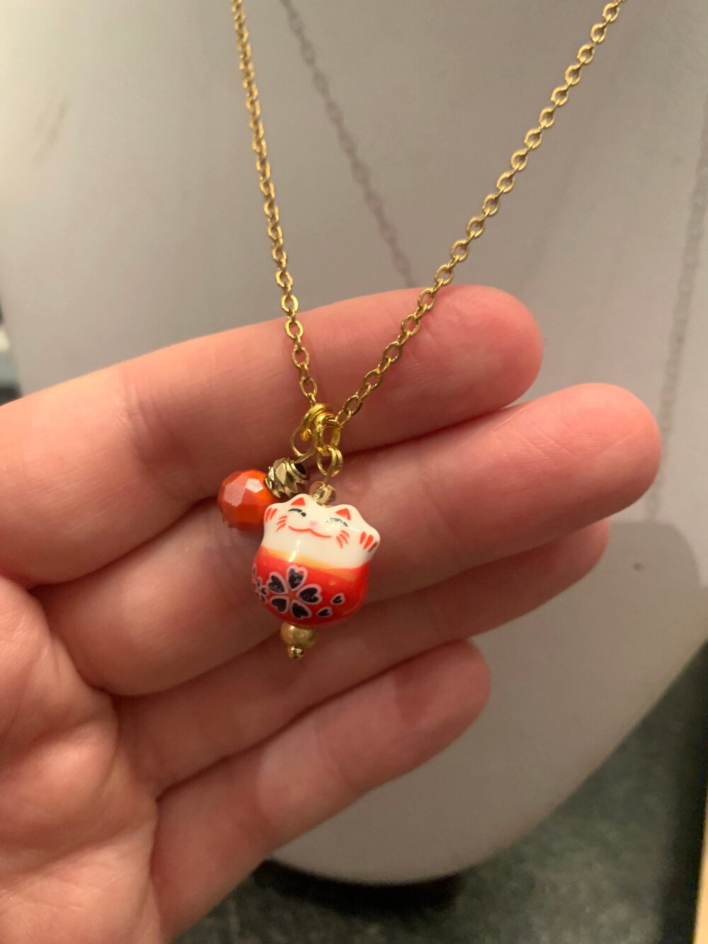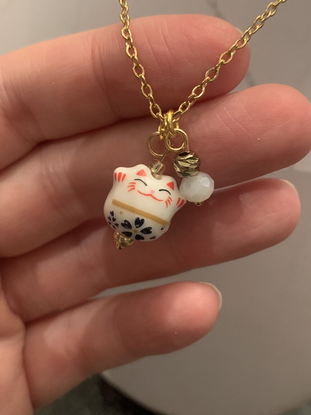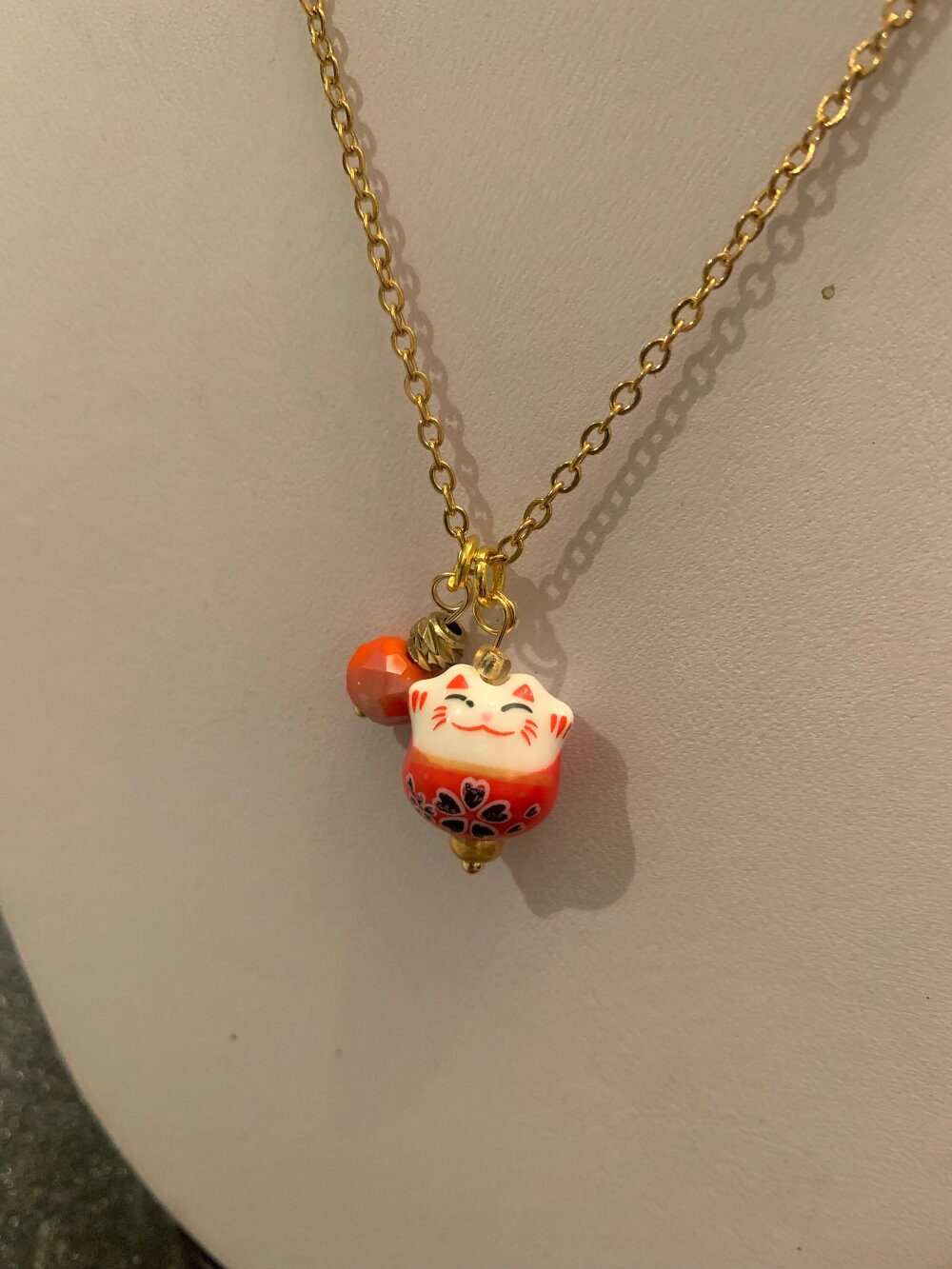 Collier pendentif chat Chinois porte bonheur , fait main et crée par nos soins.