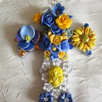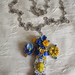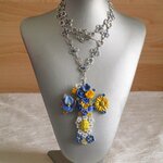 Ravissant collier pendentif composé d'une croix en bois argenté, de cabochons en céramique, de fleurs en porcelaine froide, et de strass posés sur une estampe en bois argenté en forme de croix de 11 cm de haut. Montés sur une chaine fantaisie en métal argenté et strass de 78 cm environ à l'aide d'un connecteur et d'accessoires en métal argenté.