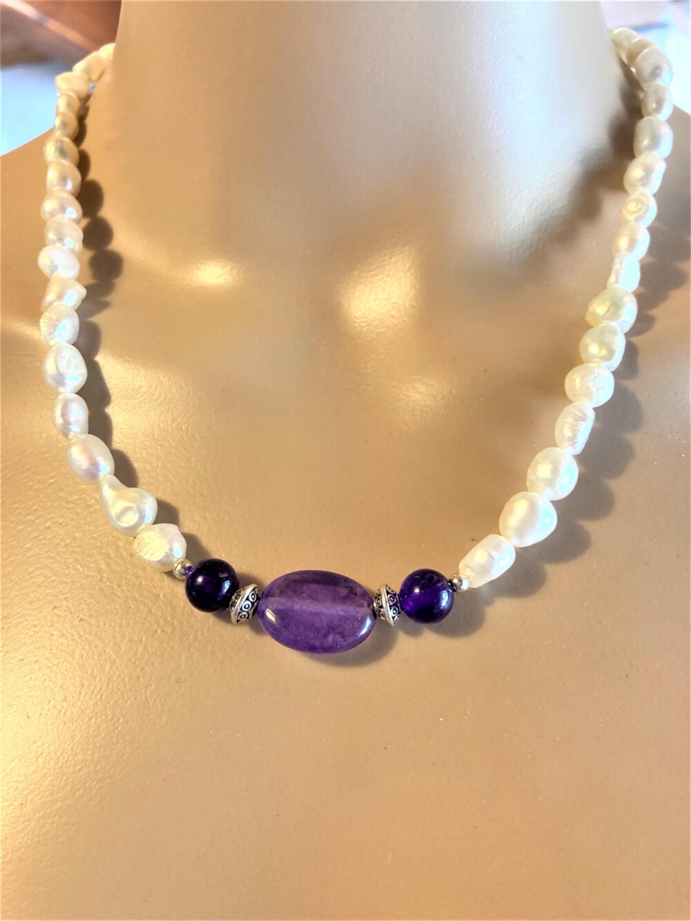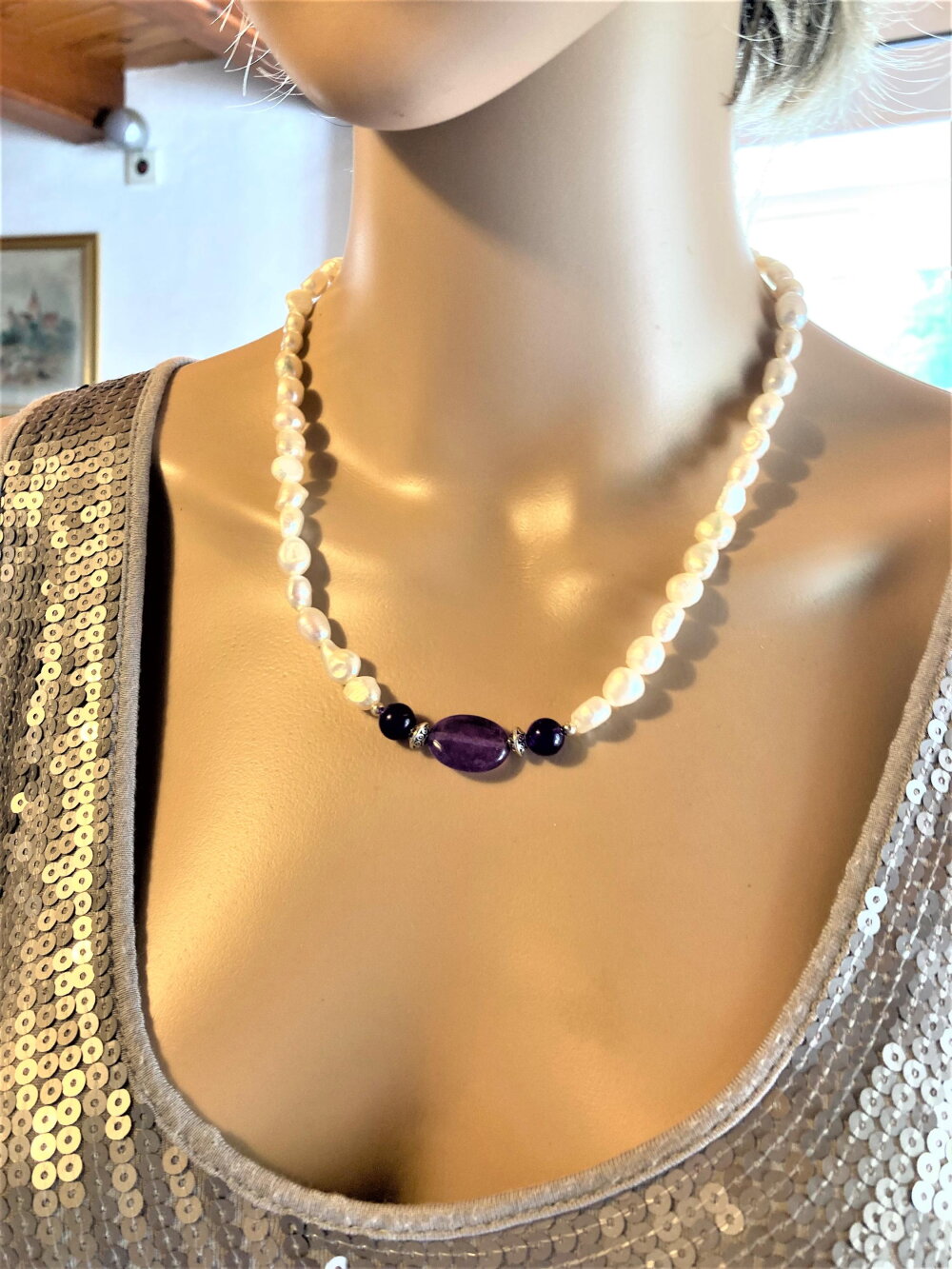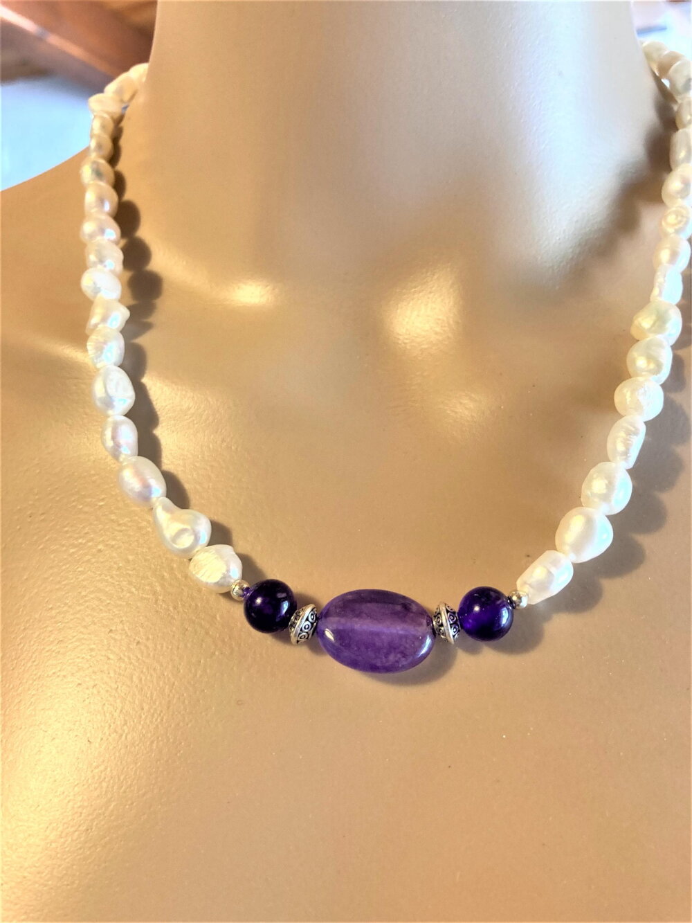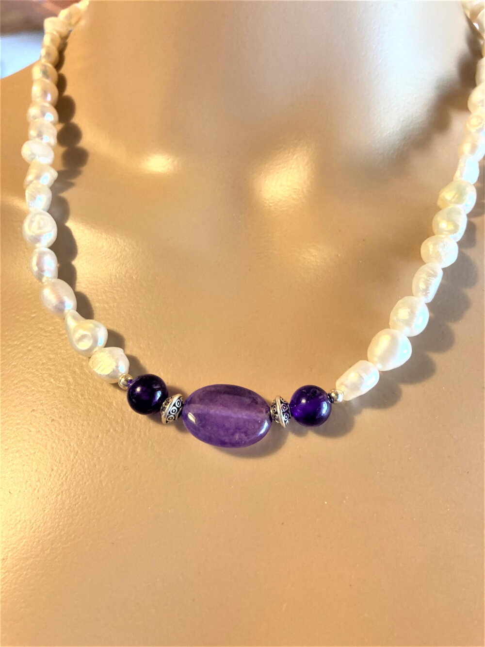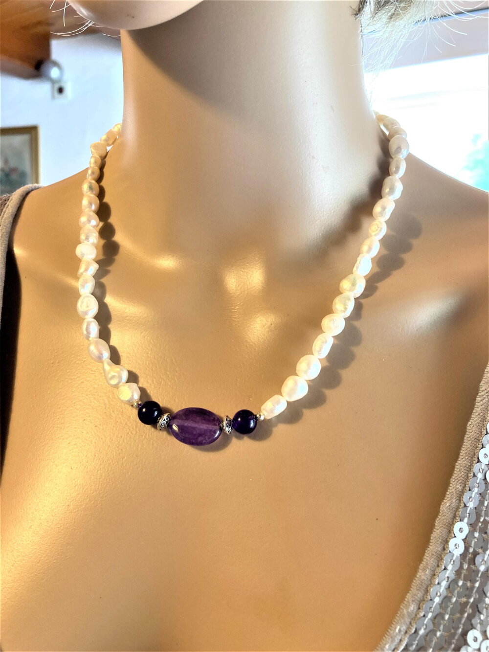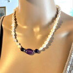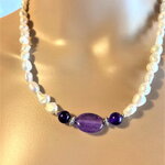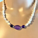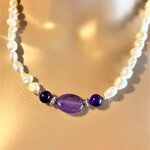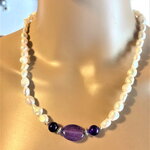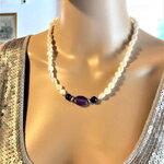 Collier perles de culture d'eau douce blanches et améthyste. Bijou femme