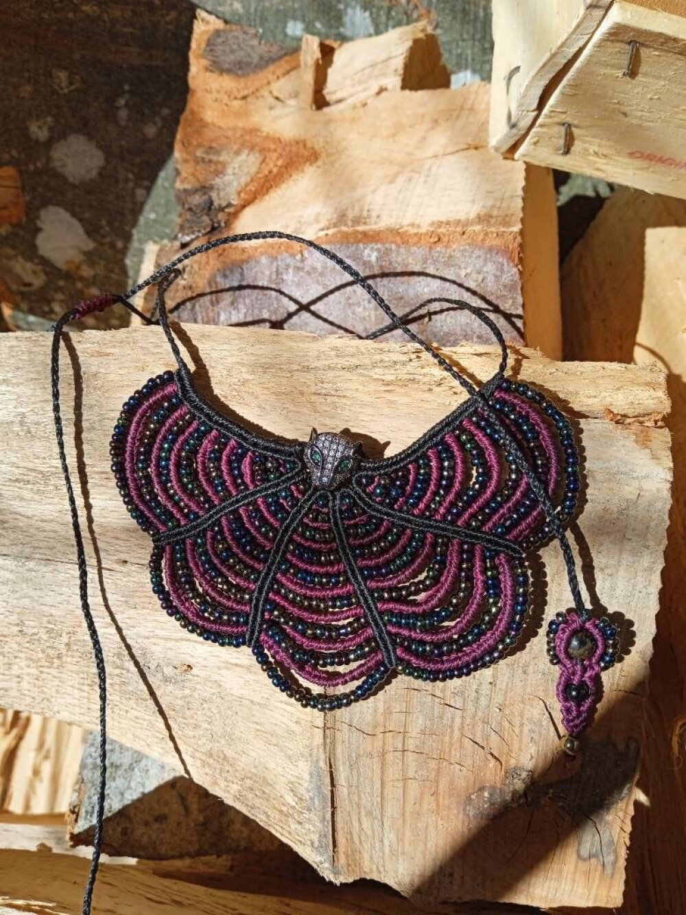 Je suis partie de cette perle panthère noire et j'ai tissé autour des perles métallisées ce collier s ajuste parfaitement à votre cou grâce à un nœud coulissant.